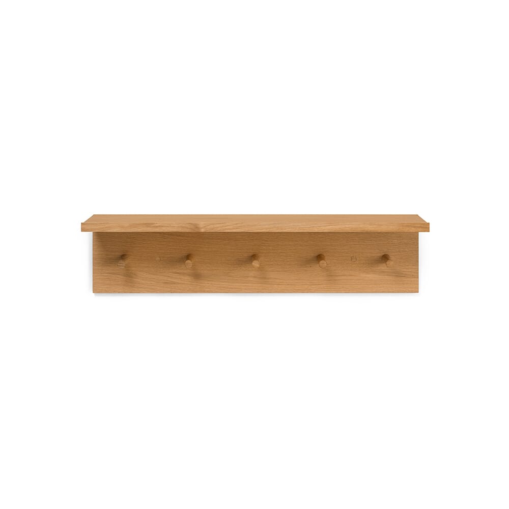 Materiale: Hylle: Oljet eikefinér med MDF-kjerne. Knagger: Oljet heltre eik.