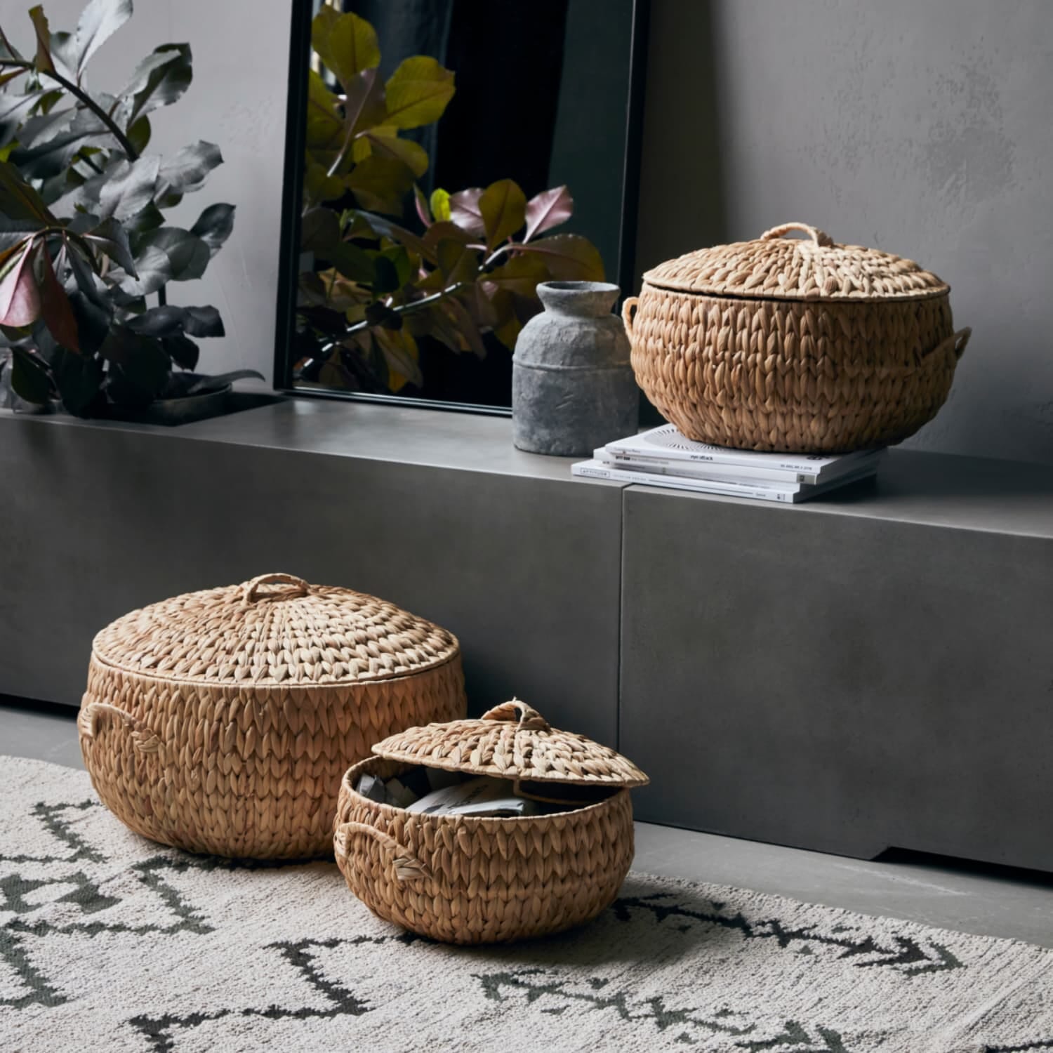 Dette settet med tre håndvevde kurver i vannhyasint gir deg fleksibel og dekorativ oppbevaring i alle hjemmets rom. De myke, naturlige teksturene skaper en vakker kontrast til glatte overflater, og gir interiøret et varmt og harmonisk preg.