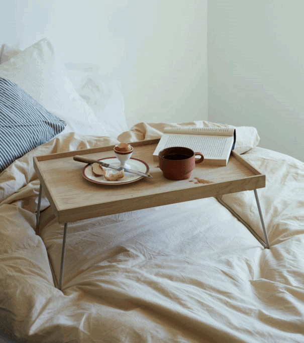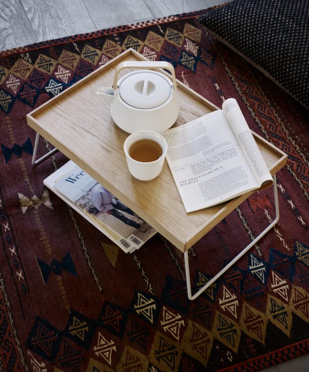 Server en deilig frokost i sengen eller en kopp kaffe på balkongen. Nomad Bordbrett i eik har sammenleggbare bein, som gjør det enkelt å plassere på toppen av puter, tepper og andre myke overflater.