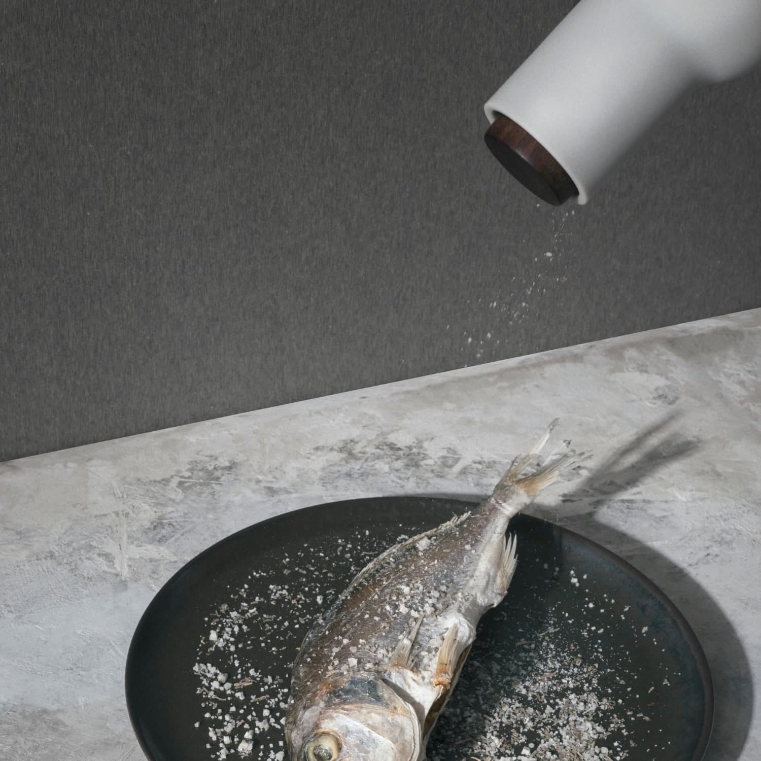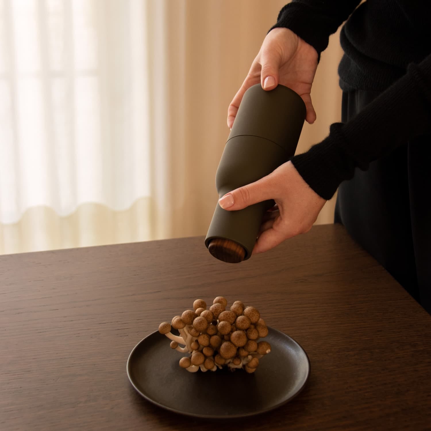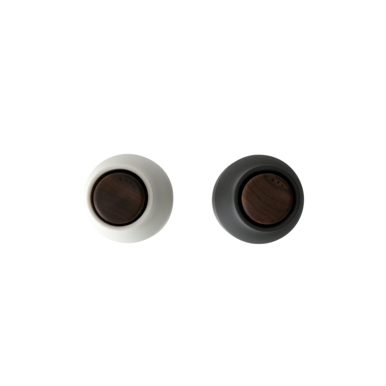 Designet av Norm Architects, har kvernene et elegant, flaskeformet uttrykk som ligger godt i hånden og gir en lun kontrast mellom den matte grå overflaten og det naturlige valnøttlokket.