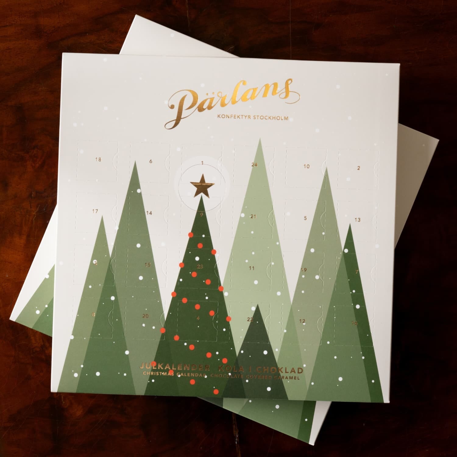 Pärlans Julekalender er en elegant og uimotståelig måte å telle ned dagene til jul på. Bak de 24 lukene skjuler det seg håndlagde karameller, alle dyppet i lys eller mørk økologisk sjokolade fra Malmö Chokladfabrik.