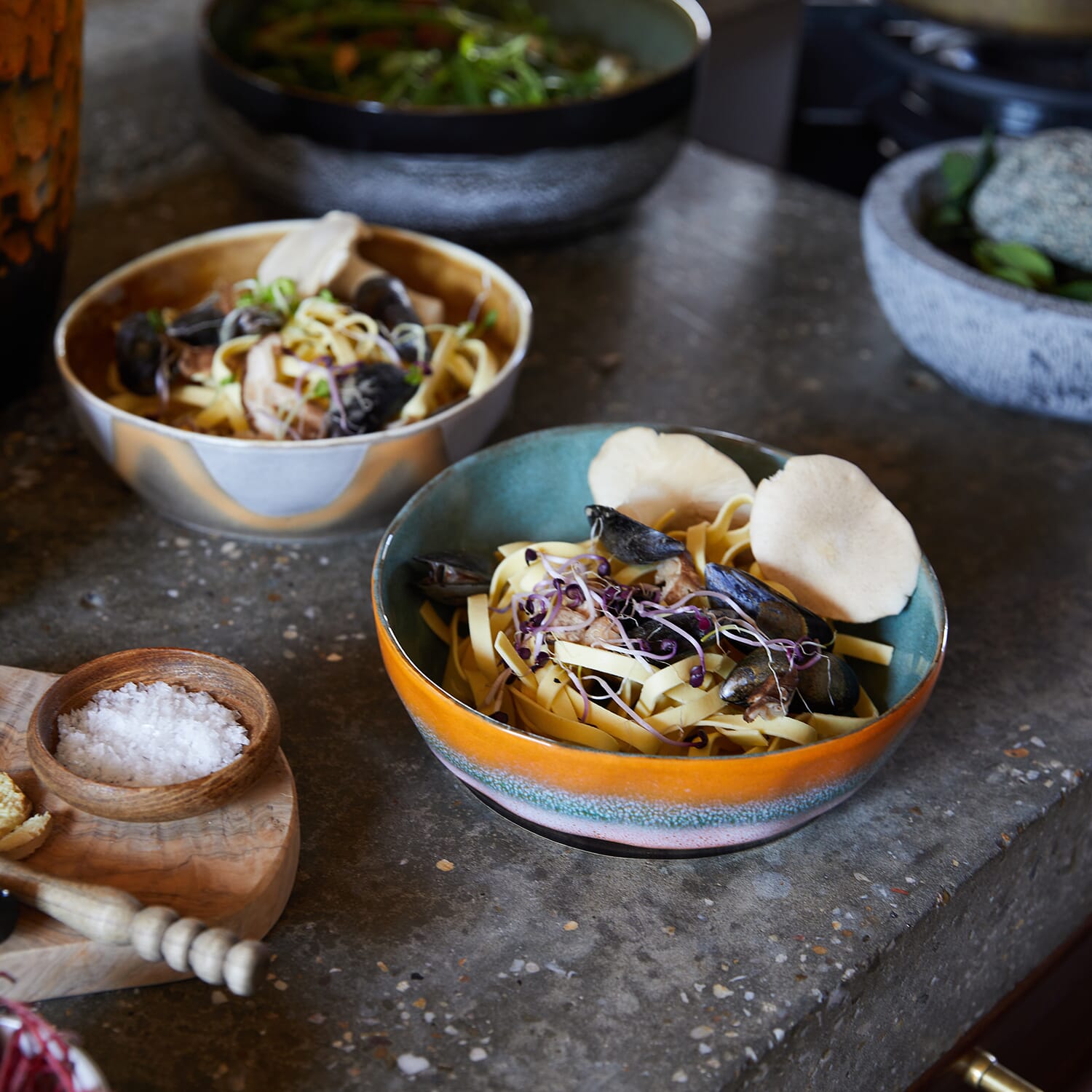 Server retten din i en unik pastaskål. Takket være de retro glasurene du kan forvente fra 70s ceramics, vil servise ditt skille seg ut fra mengden. Både innsiden og utsiden av pastaskålene er glasert for å fremheve maten din på en flott måte.