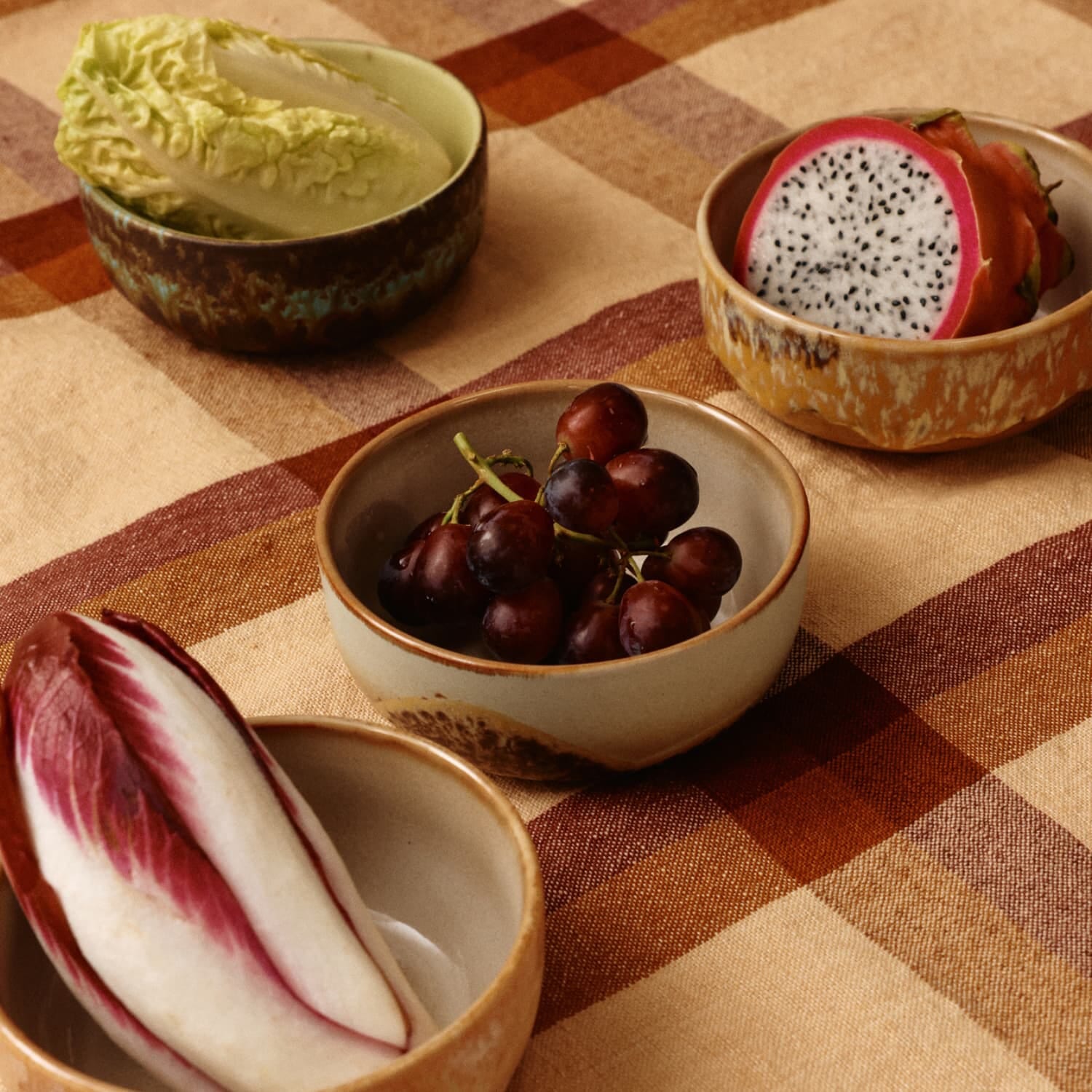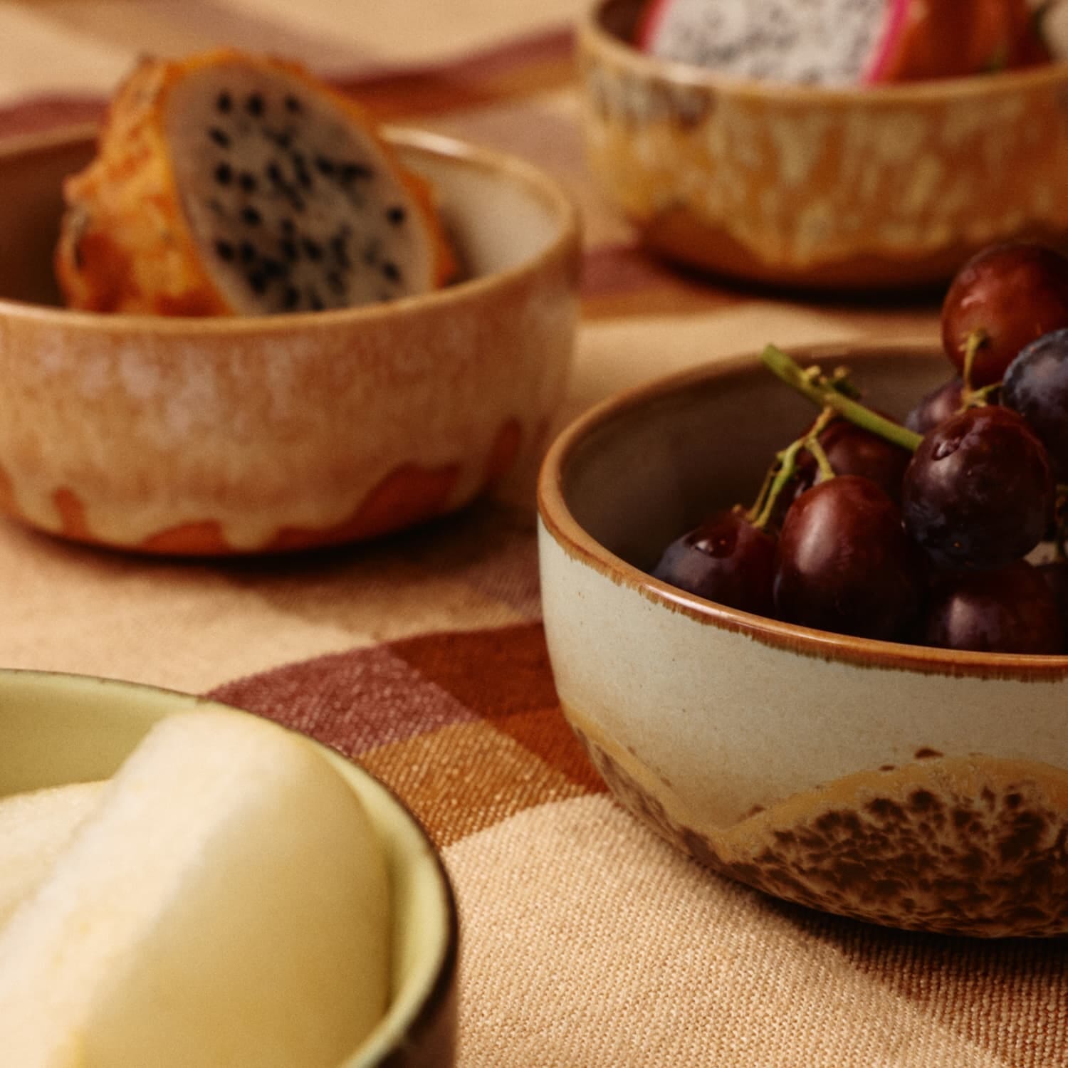Hver bolle er glasert for hånd og bærer tydelige referanser til 1970-tallets lekne estetikk – her i en ny, naturlig utførelse inspirert av rå kystlandskap. Med sitt distinkte uttrykk og organiske fargespill passer bollene perfekt både til servering av småretter, snacks eller som dekorative elementer i hyller og åpne kjøkkenhyller.