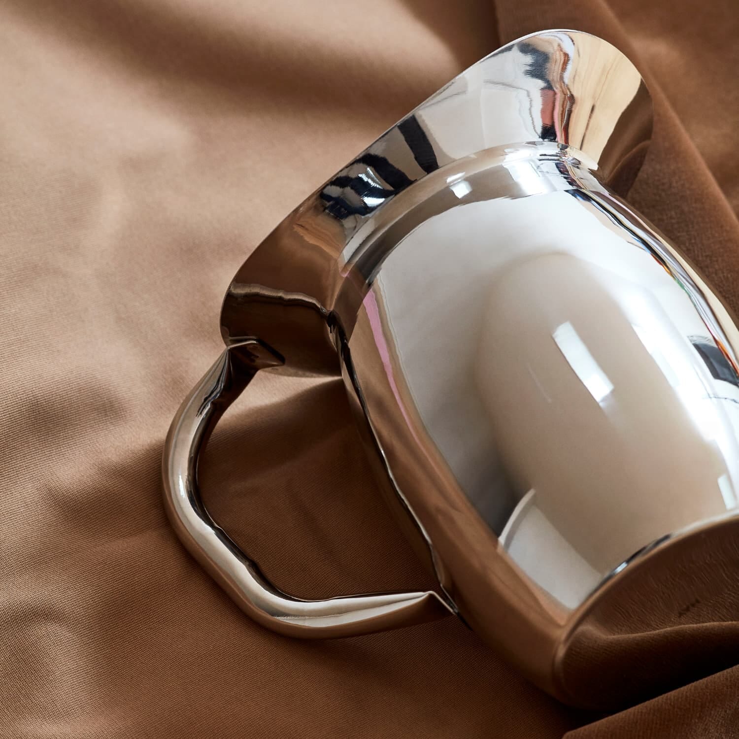 Laget i India av rustfritt stål med en elegant blank finish, kombinerer denne muggen enkel form med praktisk bruk. Den slanke håndtaket og brede hellekanten gjør det enkelt å helle uten søl, noe som gjør den ideell for alt fra melk og fløte til sauser eller dressing ved bordet. Passer perfekt både til hverdag og når du vil gjøre litt ekstra ut av serveringen.