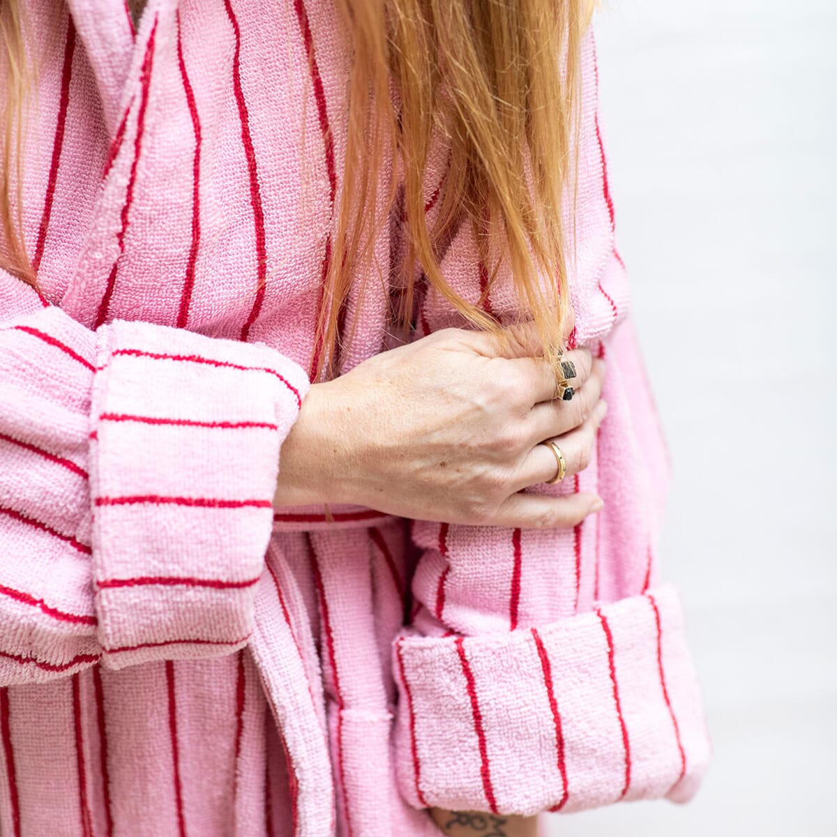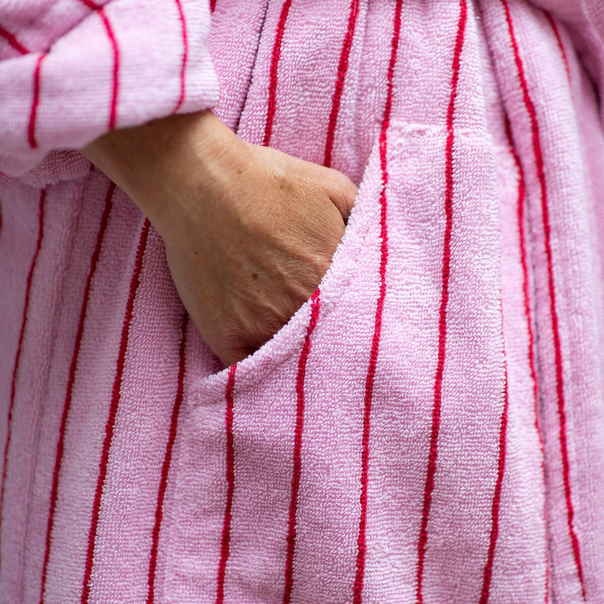 Laget i en kjemmet 385g Oeko-Tex bomull er badekåpen også svært absorberende. Det gjennomtenkte designet har store praktiske lommer, et stort jakkeslag, mykt belte – og den føles bare behagelig og myk å ta på. Du kan bevege armene fritt, enkelt stramme beltet og den er lang nok til å dekke knærne når du setter deg ned.