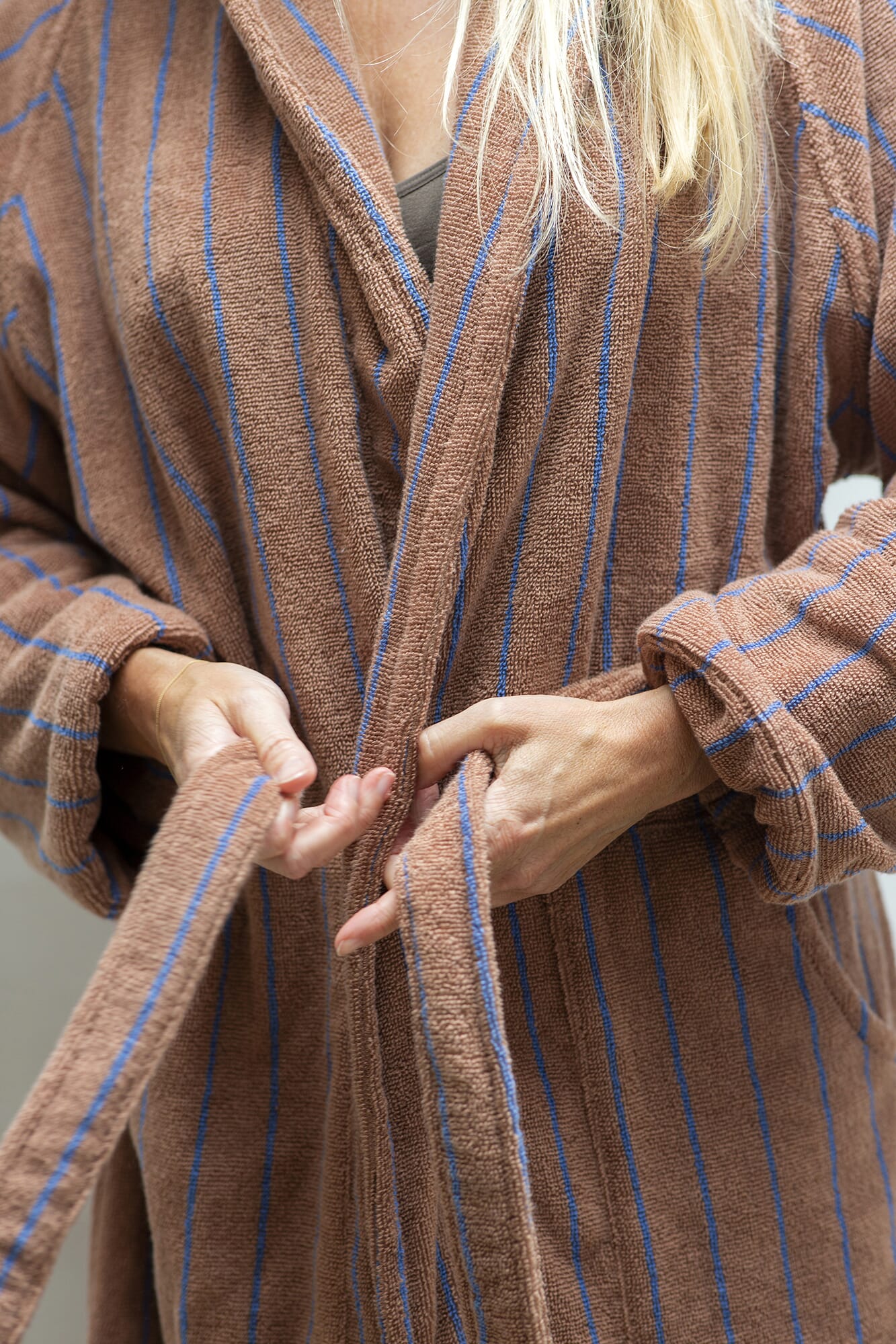 Laget i en kjemmet 385g Oeko-Tex bomull er badekåpen også svært absorberende. Det gjennomtenkte designet har store praktiske lommer, et stort jakkeslag, mykt belte – og den føles bare behagelig og myk å ta på. Du kan bevege armene fritt, enkelt stramme beltet og den er lang nok til å dekke knærne når du setter deg ned.