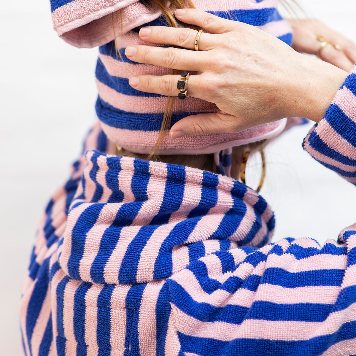 Laget i en kjemmet 385g Oeko-Tex bomull er badekåpen også svært absorberende. Det gjennomtenkte designet har store praktiske lommer, et stort jakkeslag, mykt belte – og den føles bare behagelig og myk å ta på. Du kan bevege armene fritt, enkelt stramme beltet og den er lang nok til å dekke knærne når du setter deg ned.