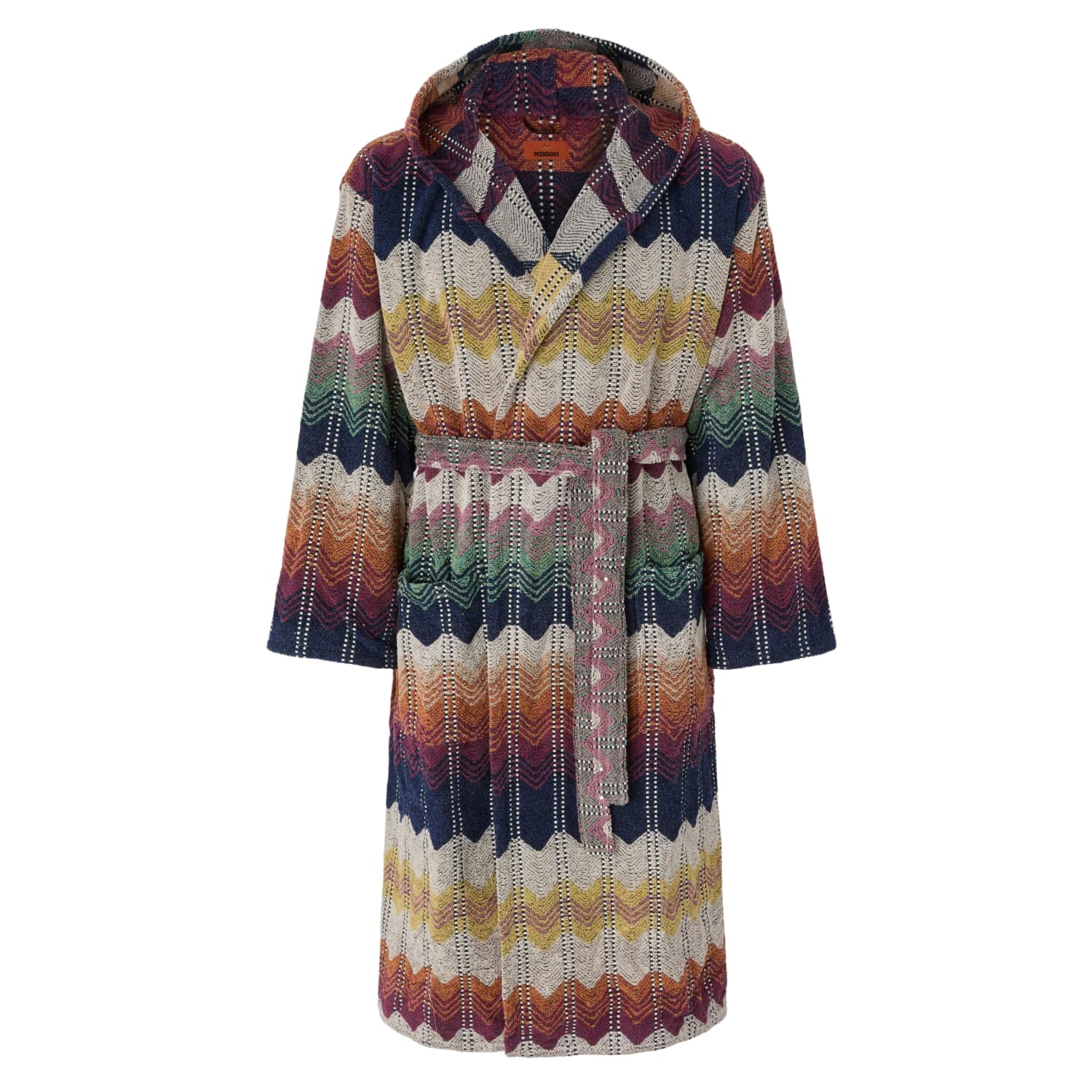 Det velkjente og livlige sikksakk-mønsteret i dempede fargetoner gir badekåpen en umiskjennelig Missoni-signatur, samtidig som den tilfører eleganse og varme til både morgenrutiner og avslappende kvelder.
