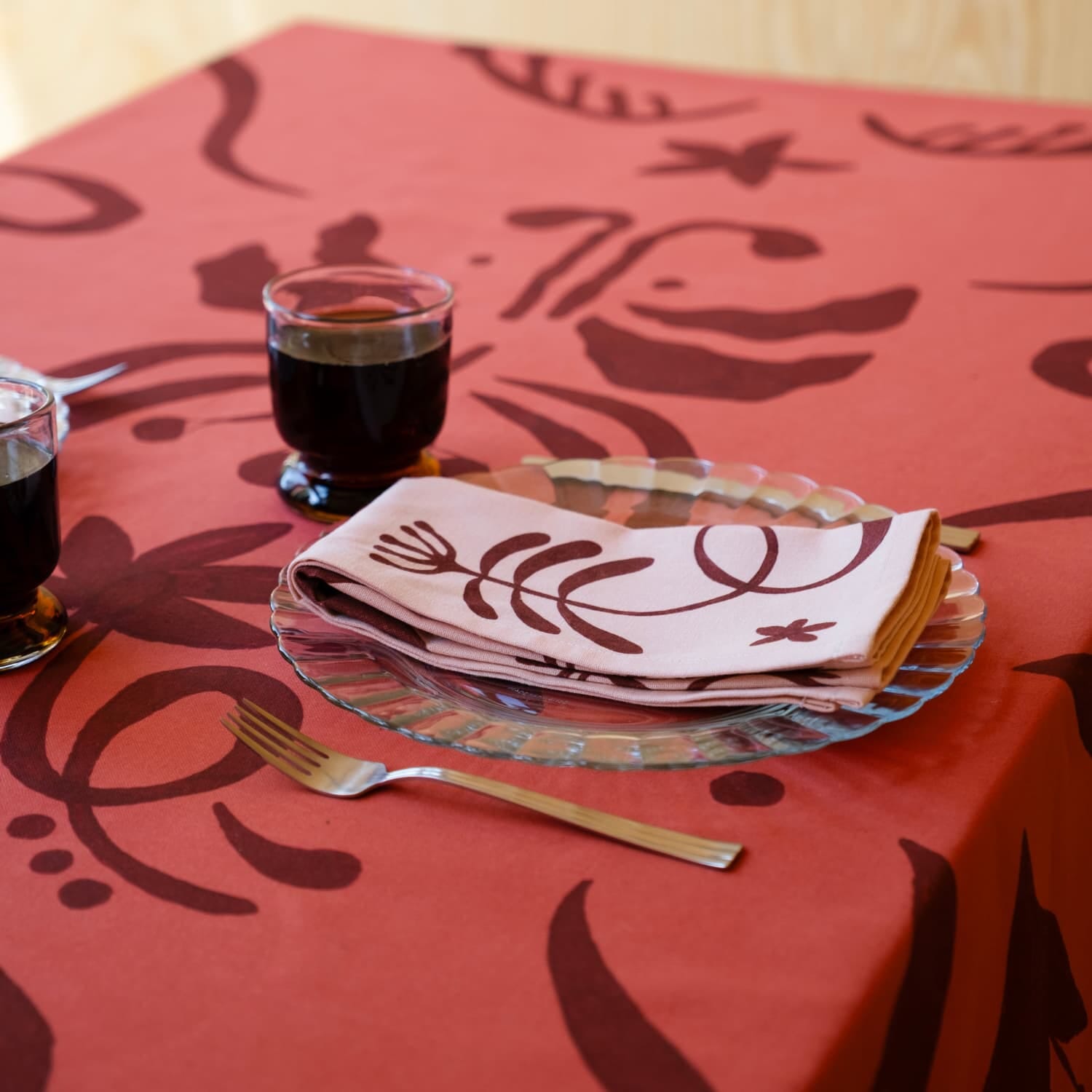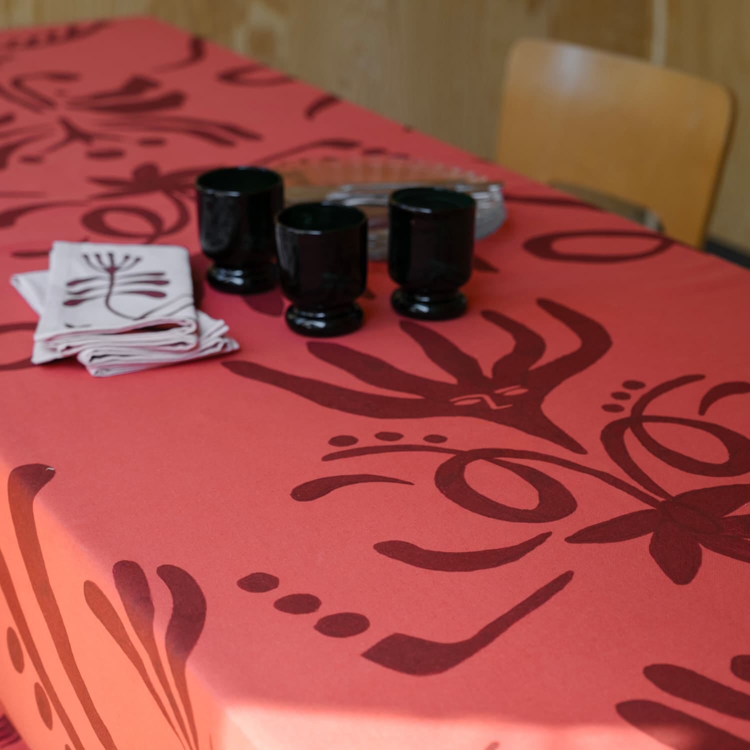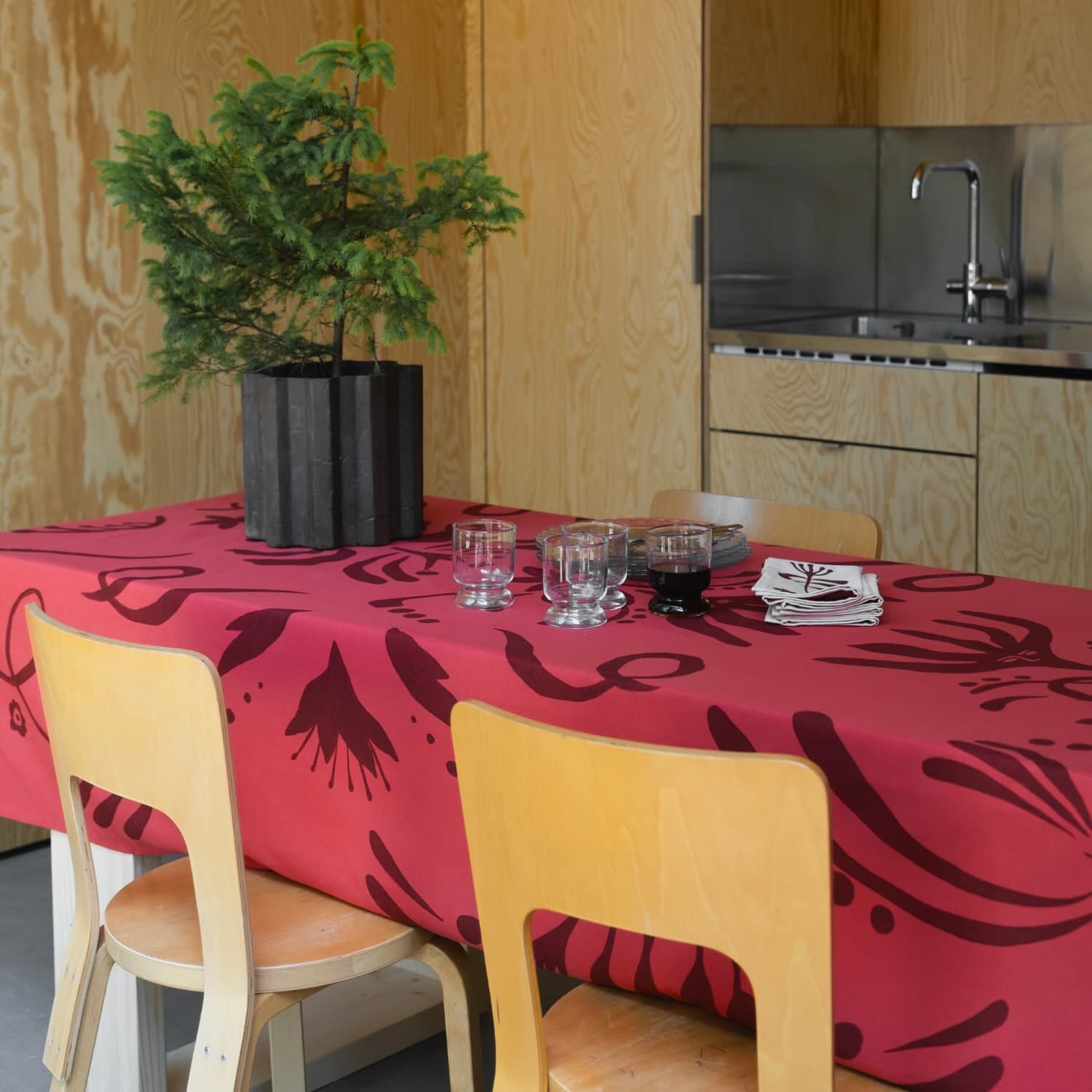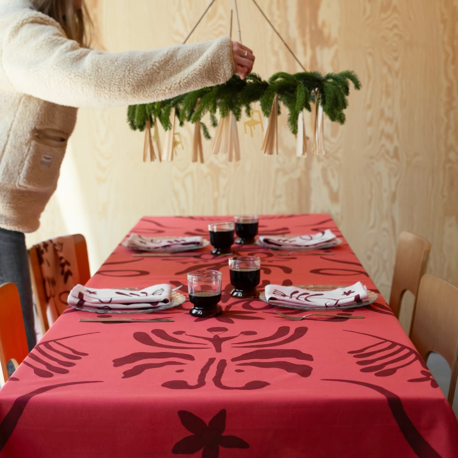Designet av Elisabeth Dunker for Fine Little Day, er duken dekorert med et kunstnerisk, naturinspirert mønster i dype røde toner på rød bunn. Resultatet er en bordduk som både føles tradisjonell og moderne, og som gir borddekkingen et uttrykk av fest og fellesskap.