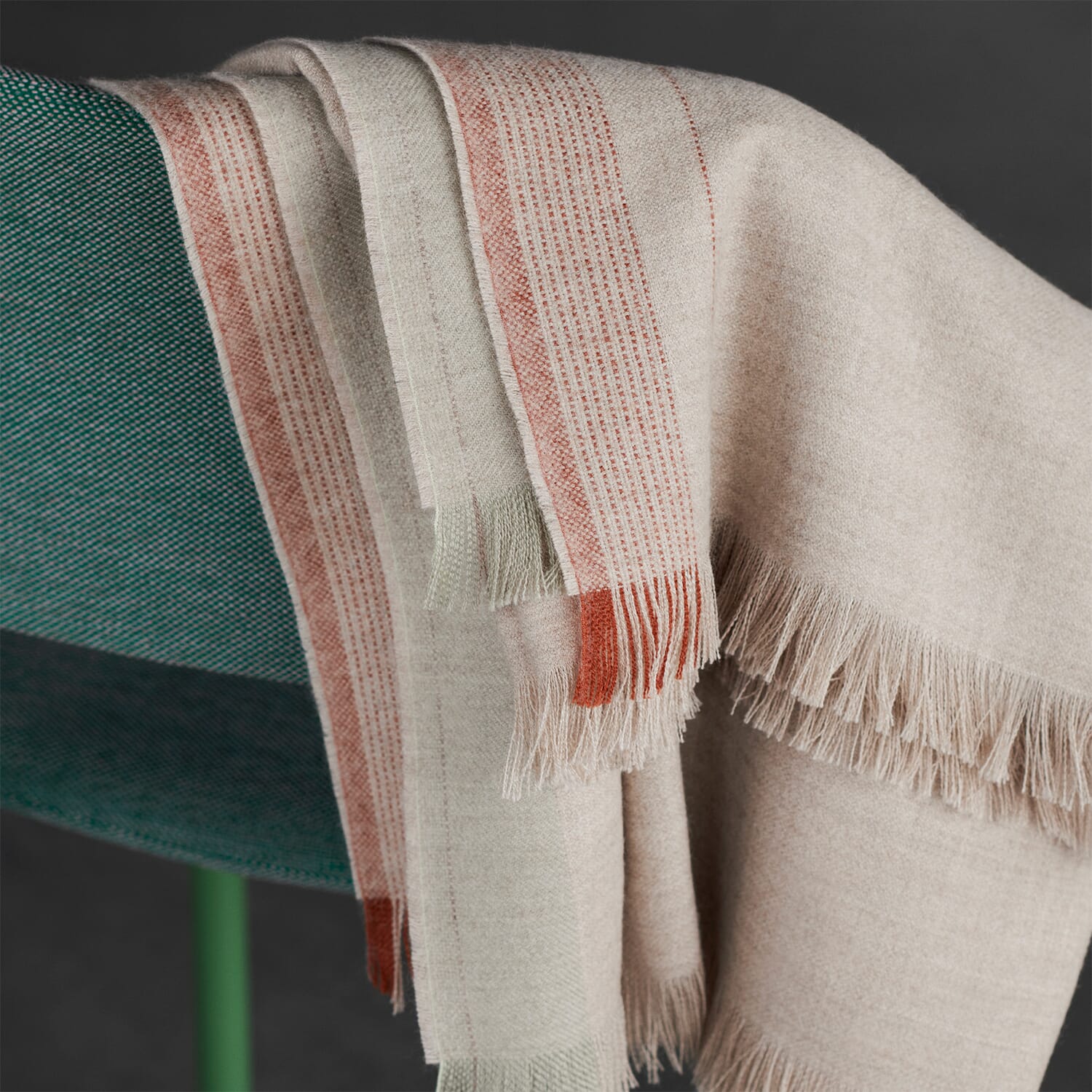 Kolleksjonen Ècru er designet av danske Cecilie Manz og består av tre pledd. De skiller seg fra hverandre både i grunnfargen og i de diskrete stripene langs kantene som varierer i både veving og farge, noe som gir hvert pledd sin egen unike identitet. Pleddene kommer i tre klassiske grunnfarger - en myk beige, en hvitt og en brun. Alle er alpakkaullens naturlige farger, noe som betyr at fibrene ikke er farget.