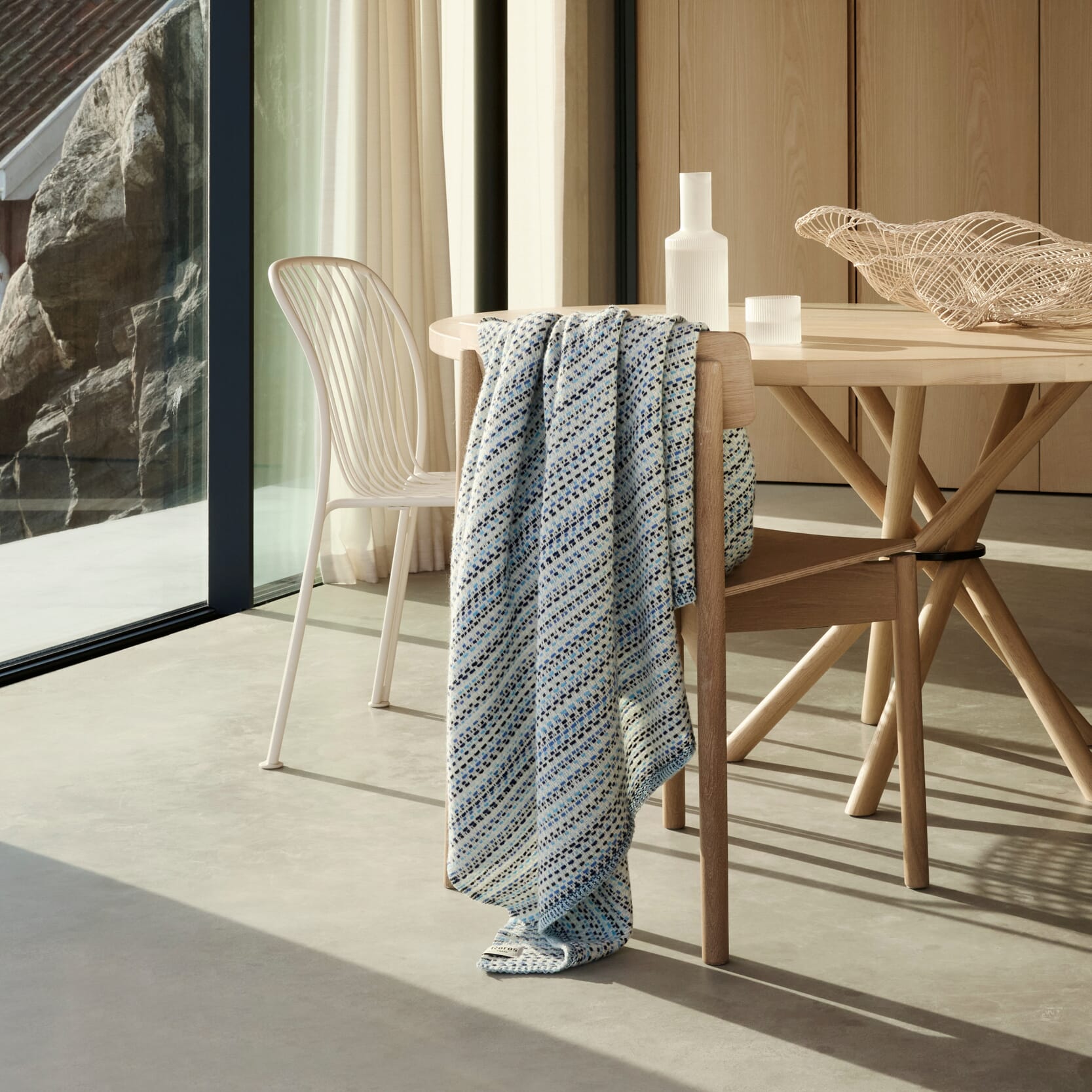 Opplev komfort og skandinavisk eleganse med Juli – en serie av myke, eksklusive pledd designet for å tilføre varme og stil til hjemmet ditt. Juli-pleddene er laget med inspirasjon fra en annen tradisjonell tekstilteknikk: broderi. De fargerike garntrådene løper gjennom den hvite basen som tilfeldige, vakre sting av farger, noe som gir et unikt og håndlaget preg til hvert teppe.