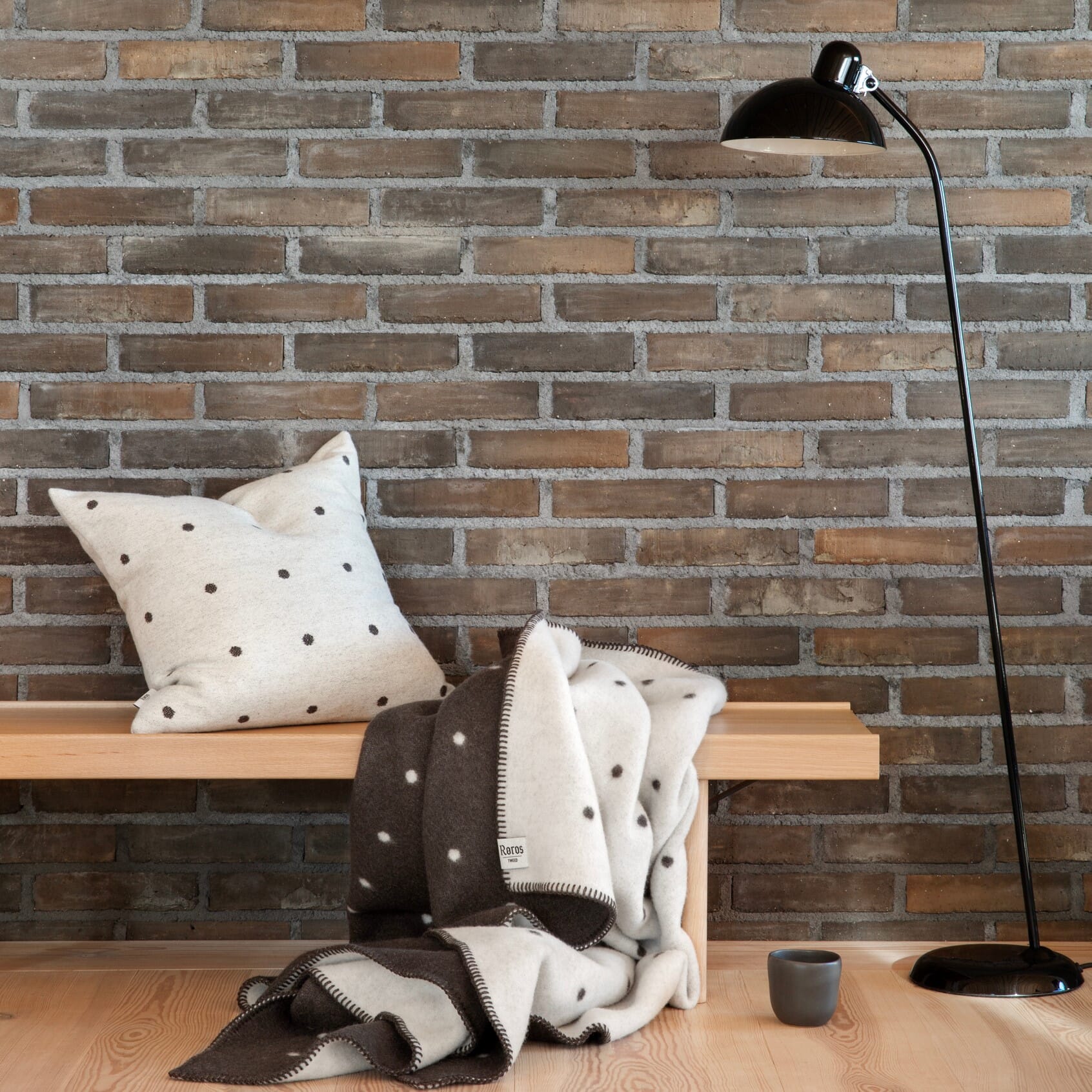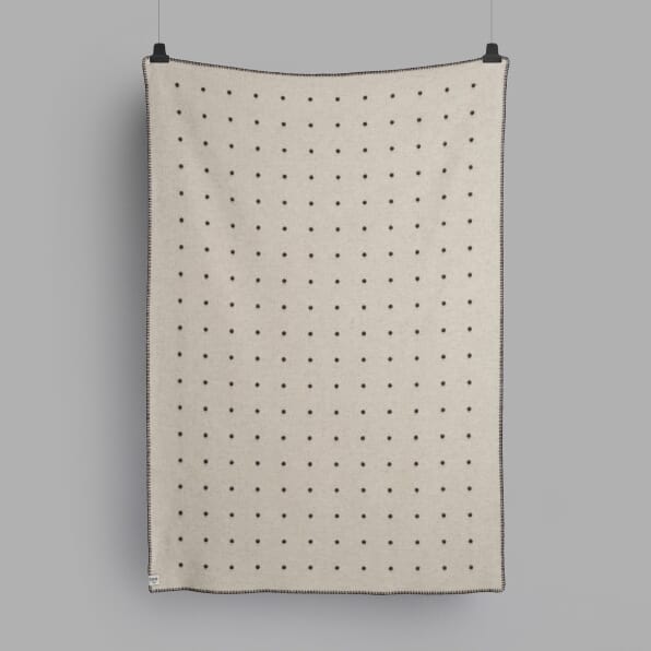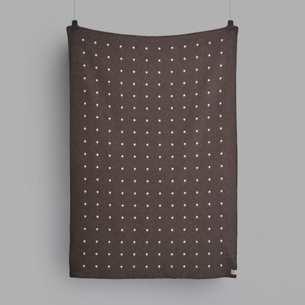 Pastille følger en Røros Tweed-tradisjon med nordiske grafikkelementer. Det åpne rutenettet med kontrastprikker etterlater et rent og strukturert inntrykk.