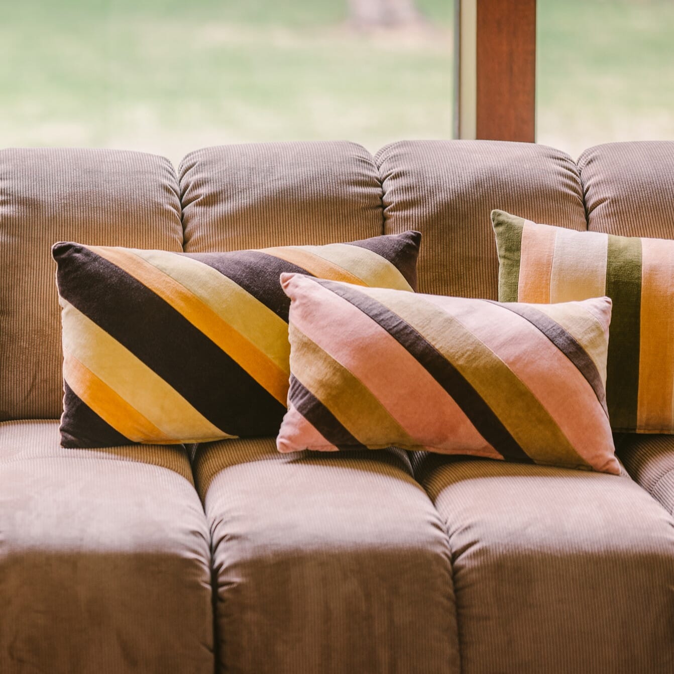 Den stripete fløyelsputen har evnen til å skille seg ut. Med sin luksuriøs tekstur og spennende fargevalg kan den brukes til både kombinering og som et iøynefallende element i en mer subtil sammensetning.