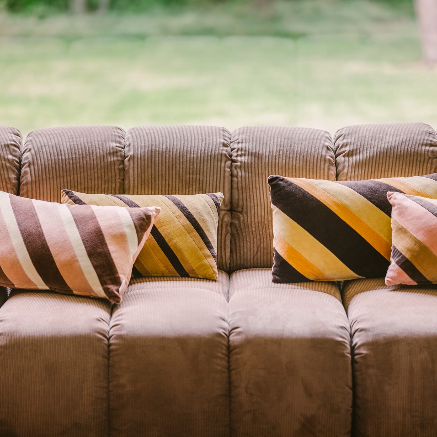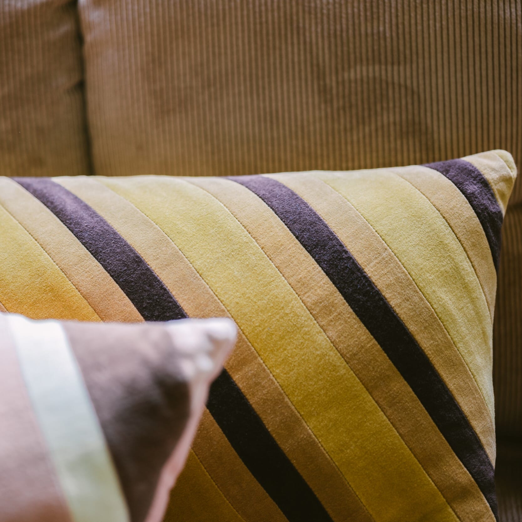 Den stripete fløyelsputen har evnen til å skille seg ut. Med sin luksuriøs tekstur og spennende fargevalg kan den brukes til både kombinering og som et iøynefallende element i en mer subtil sammensetning.
