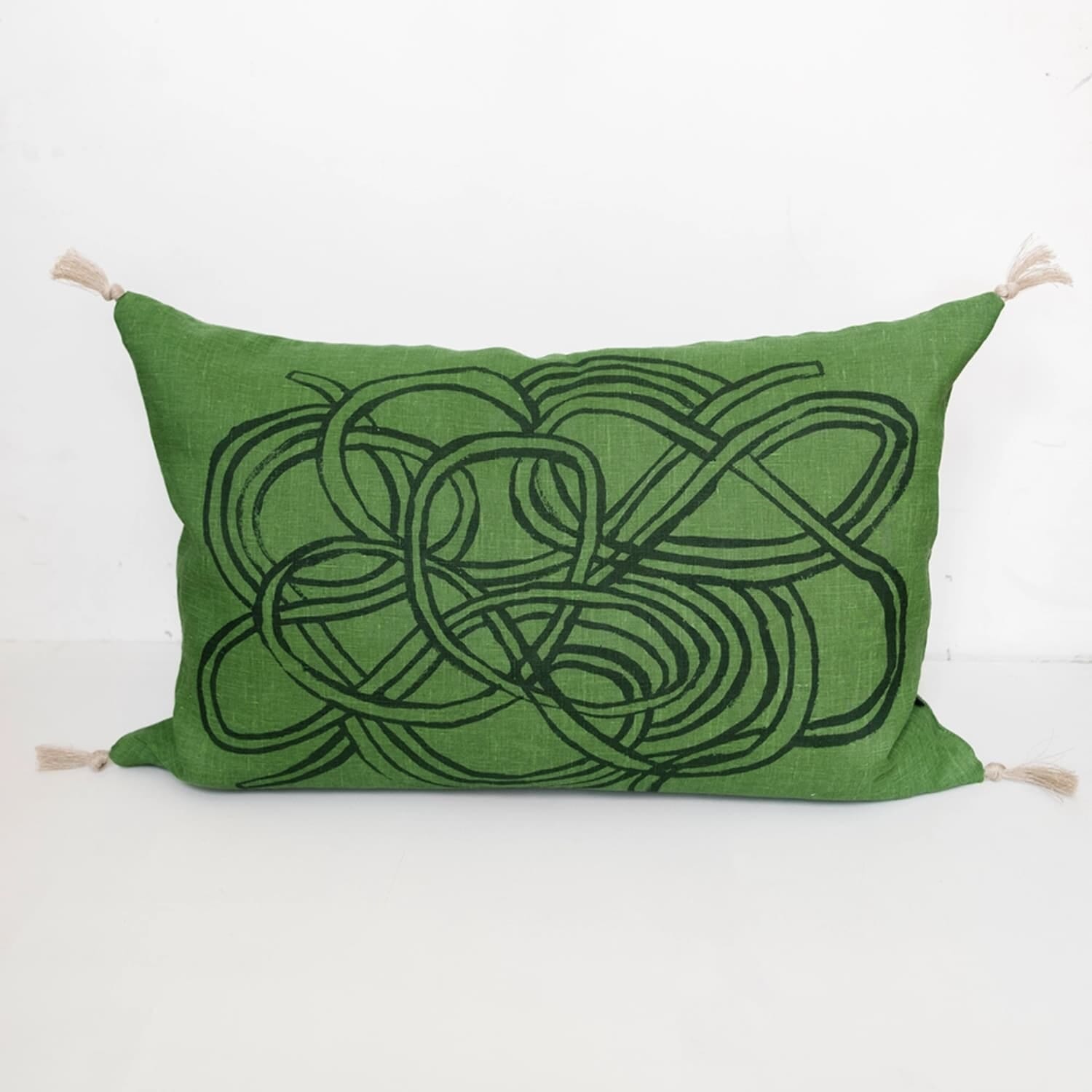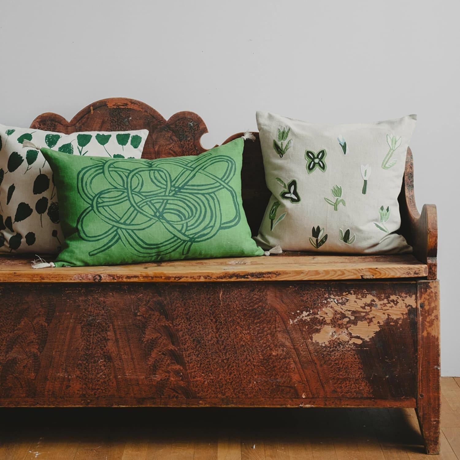 Med sitt friske grønne mønster og sjarmerende linfrynser tilfører det både liv og tekstur til hjemmet, enten det plasseres i sofaen, lenestolen eller på sengen. Det grafiske mønsteret i grønt og mørkegrønt skaper en spennende kontrast som gir et moderne, men samtidig naturlig uttrykk.