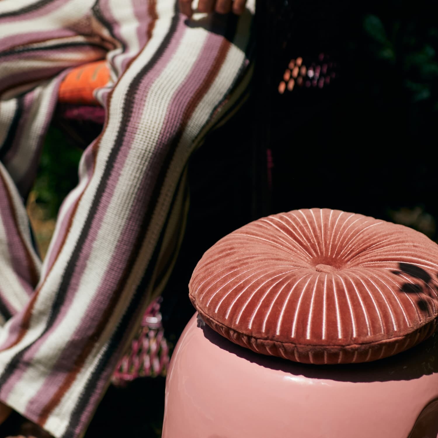 Den runde formen og den knappetuftede midten gir puten et sofistikert uttrykk, mens det myke bomullsstoffet føles behagelig og luksuriøst. Perfekt som en dekorativ aksent i sofaen, på sengen eller i en god lenestol. Den lille størrelsen gjør den enkel å kombinere med andre tekstiler og former, og den tilfører et delikat snev av både farge og tekstur i ethvert rom.