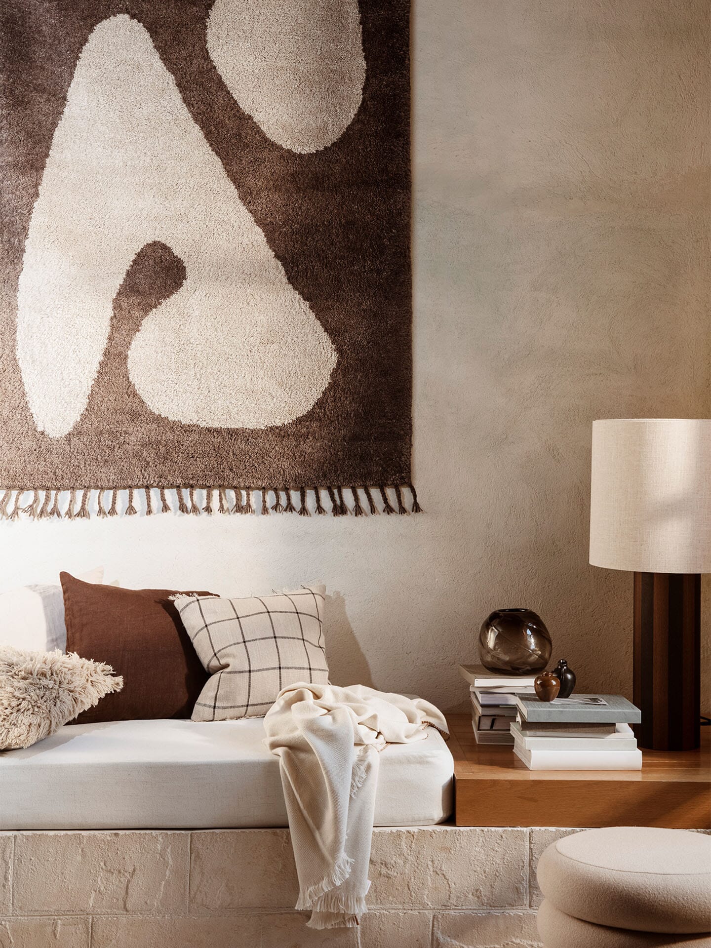 Skap atmosfære i ethvert rom med det fantastiske Abstrakt teppet fra Ferm Living. Med det skulpturelle mønsteret er dette teppet ikke bare for gulvet, men lekkert å henge på veggen som veggdekorasjon. Teppet er laget av den mykeste New Zealand-ullen i beroligende, jordnære nyanser.