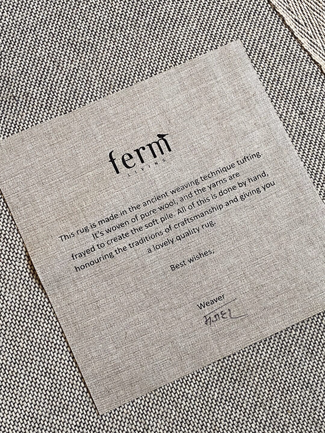 Pleieinstruksjoner: Kun støvsuging. I begynnelsen bør teppet støvsuges ofte for å fjerne naturlig loing. Ikke gni på våte flekker, men absorber dem med papirhåndklær og rengjør med en fuktig klut. Profesjonell tepperens anbefales om nødvendig.
