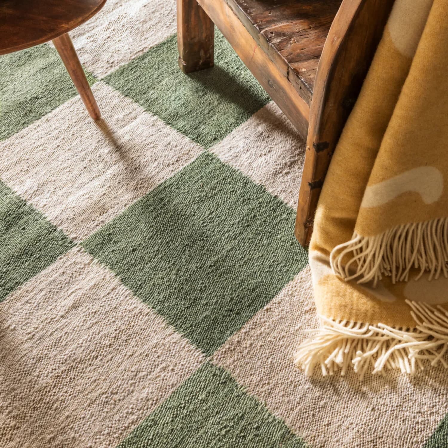 Med sitt dristige, grafiske sjakkmønster og varme grønntoner bringer teppet både personlighet og balanse inn i rommet. Hvert teppe er laget av naturlig jute, som ikke bare gir en rustikk tekstur, men også en myk og levende dybde til gulvflaten.