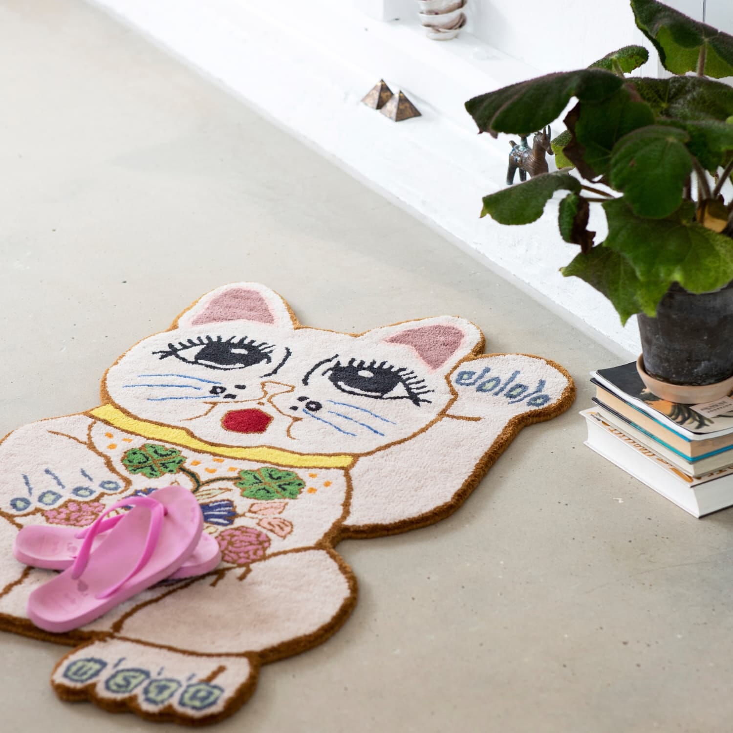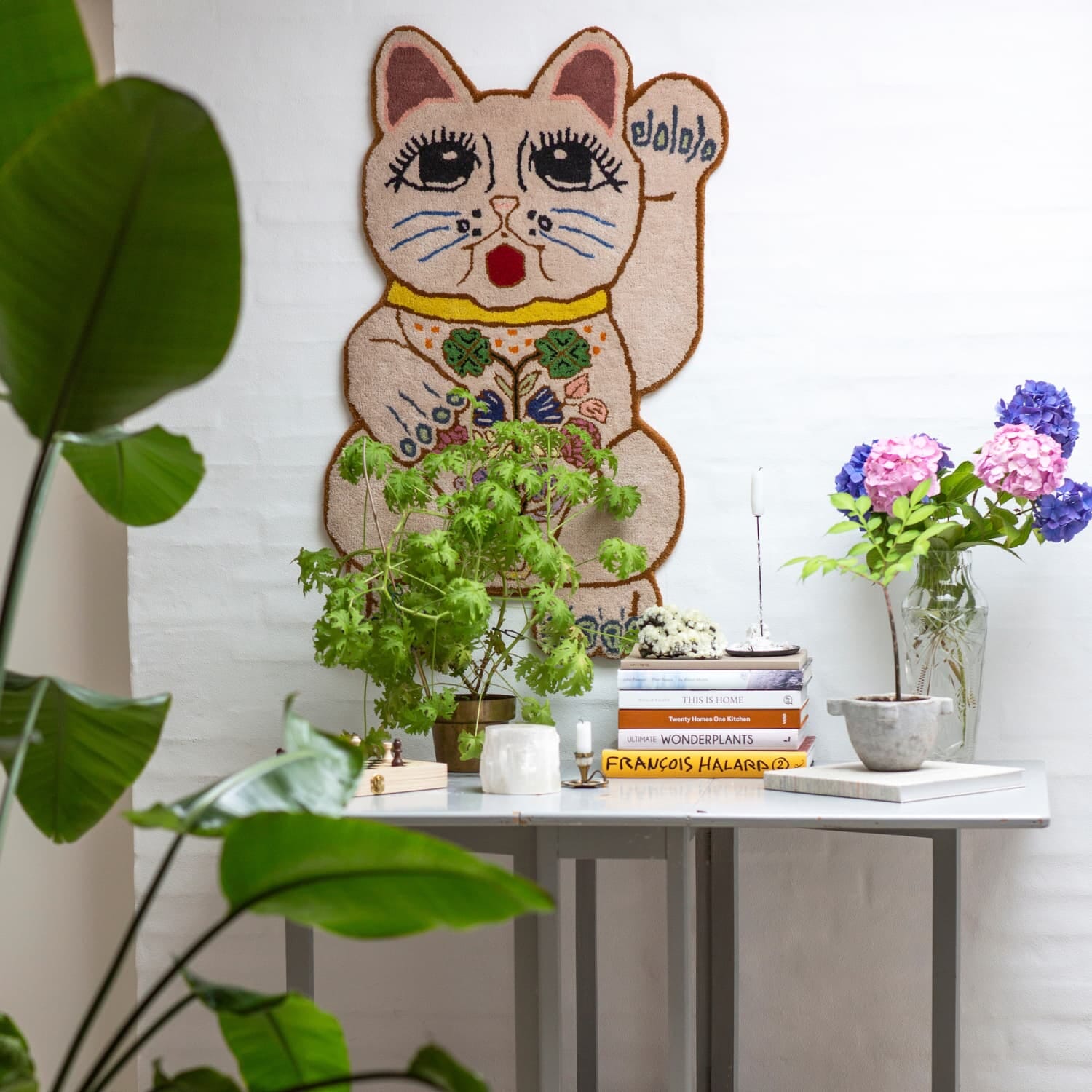 Inspirert av den ikoniske Lucky Cat, er dette unike teppet rikt dekorert med blomster, detaljer og symboler som firkløveren – et uttrykk for både hell og estetisk glede.