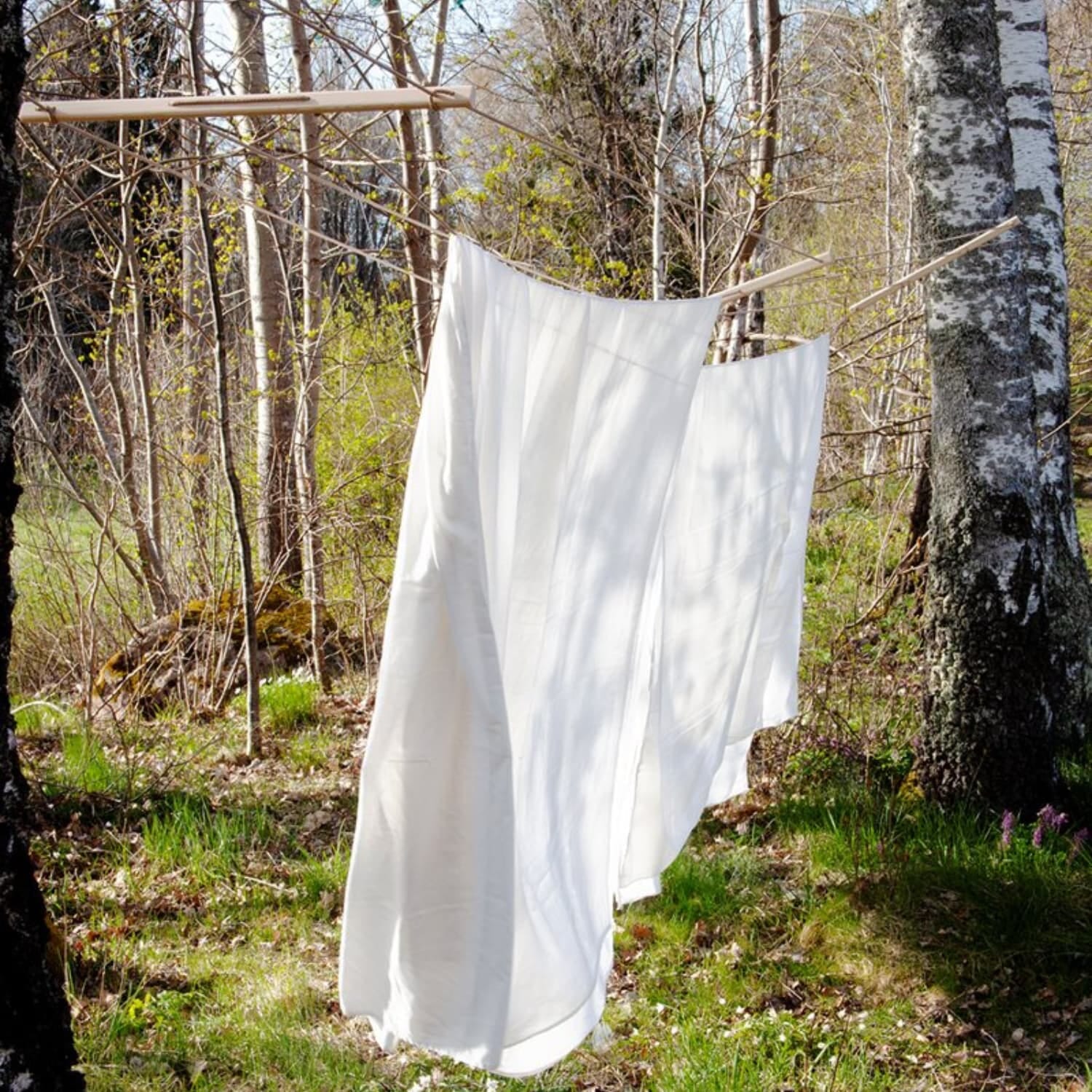 Tørkesnoren består av fire sterke PP-Silk liner festet til to støttestaver i furu, og gir deg hele 12 meter hengeplass – ideell for sengetøy, håndklær eller hverdagsvask.