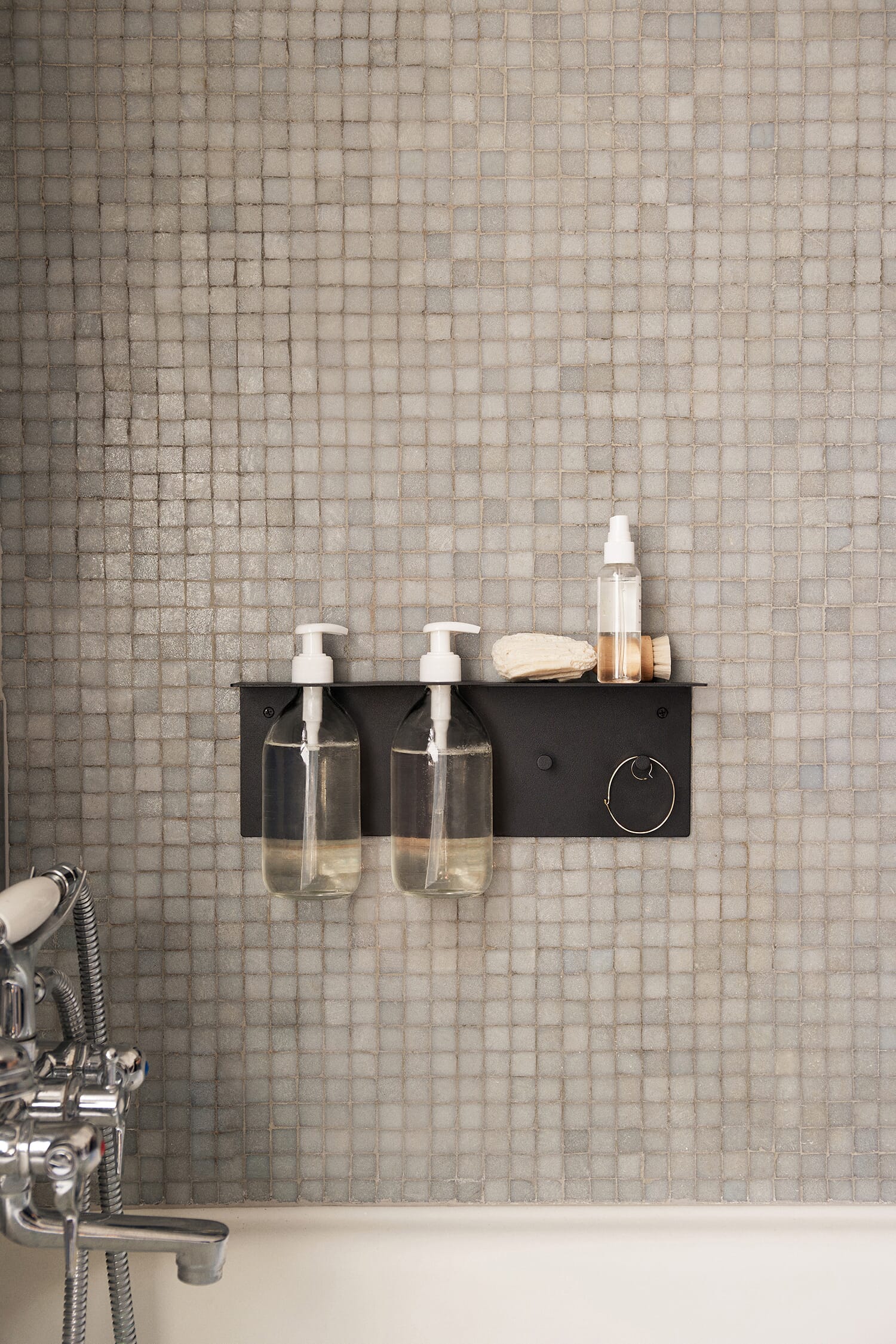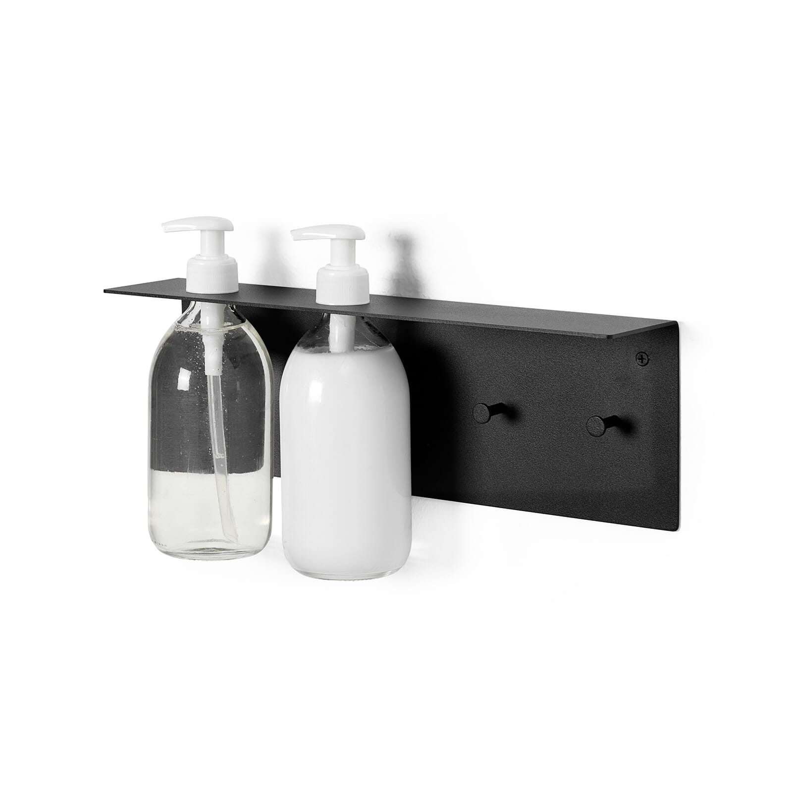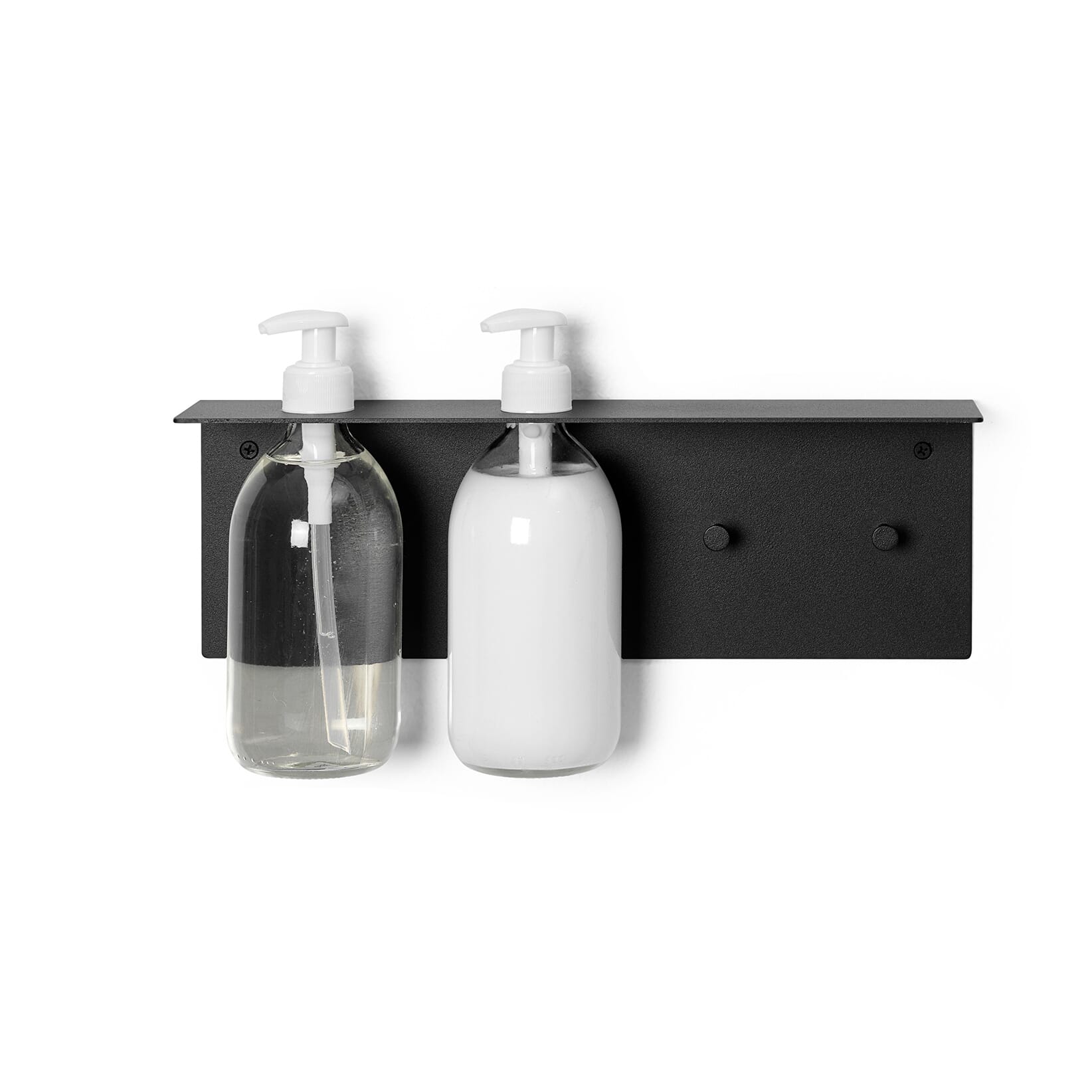 Dora baderomshylle har to hull for pumpeflasker, slik at du på en smart måte kan henge dem opp på veggen. I tillegg har den to kroker som du kan henge børster eller dusjsvamper fra. Monter den minimalistiske hyllen på baderomsveggen for å legge til et moderne og funksjonelt element.