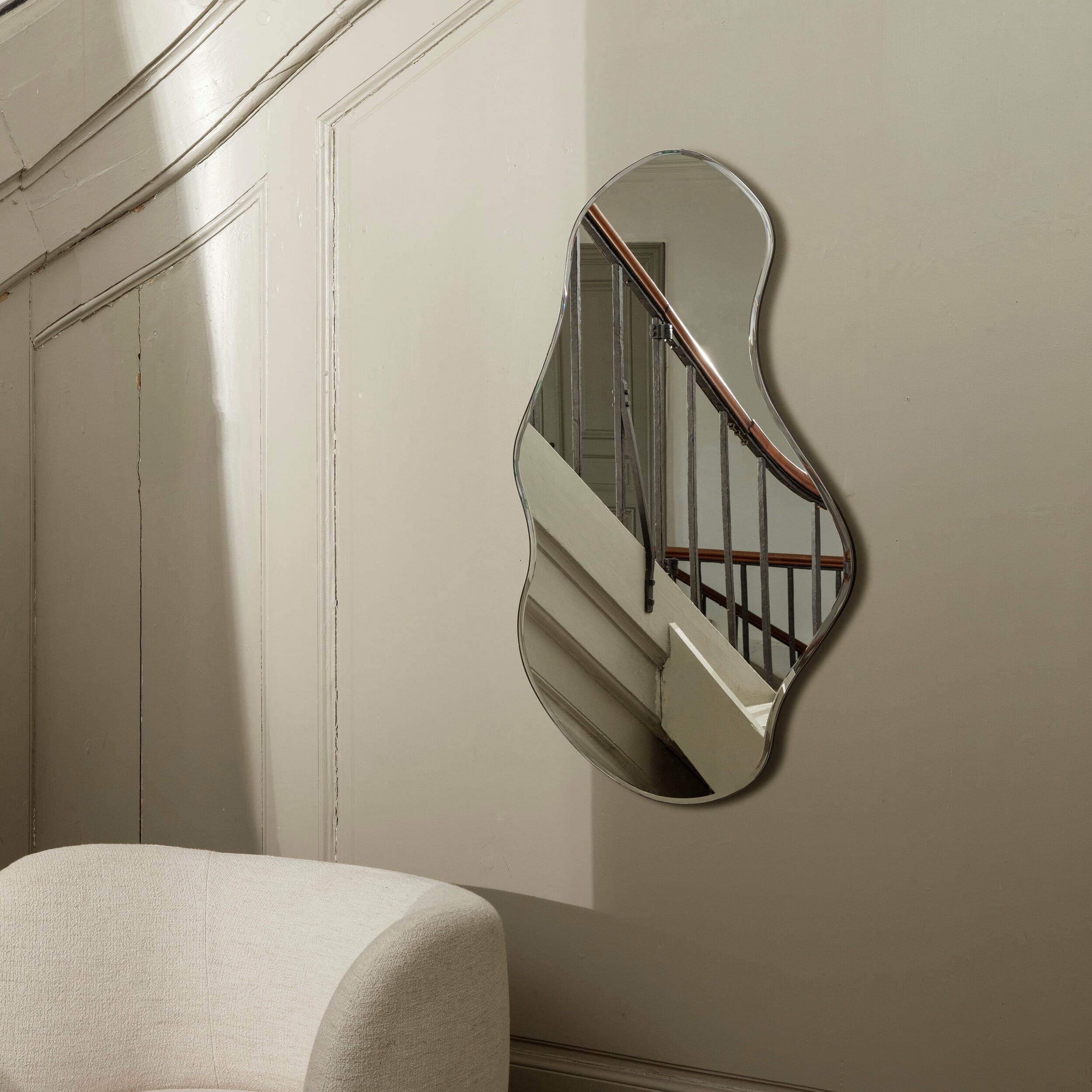 Inspirert av bevegelsen av frittflytende vann, inviterer speilet åpne og flytende former inn i ditt hjem, hvilket gjør det funksjonelle speilet til et dekorativt veggelement.