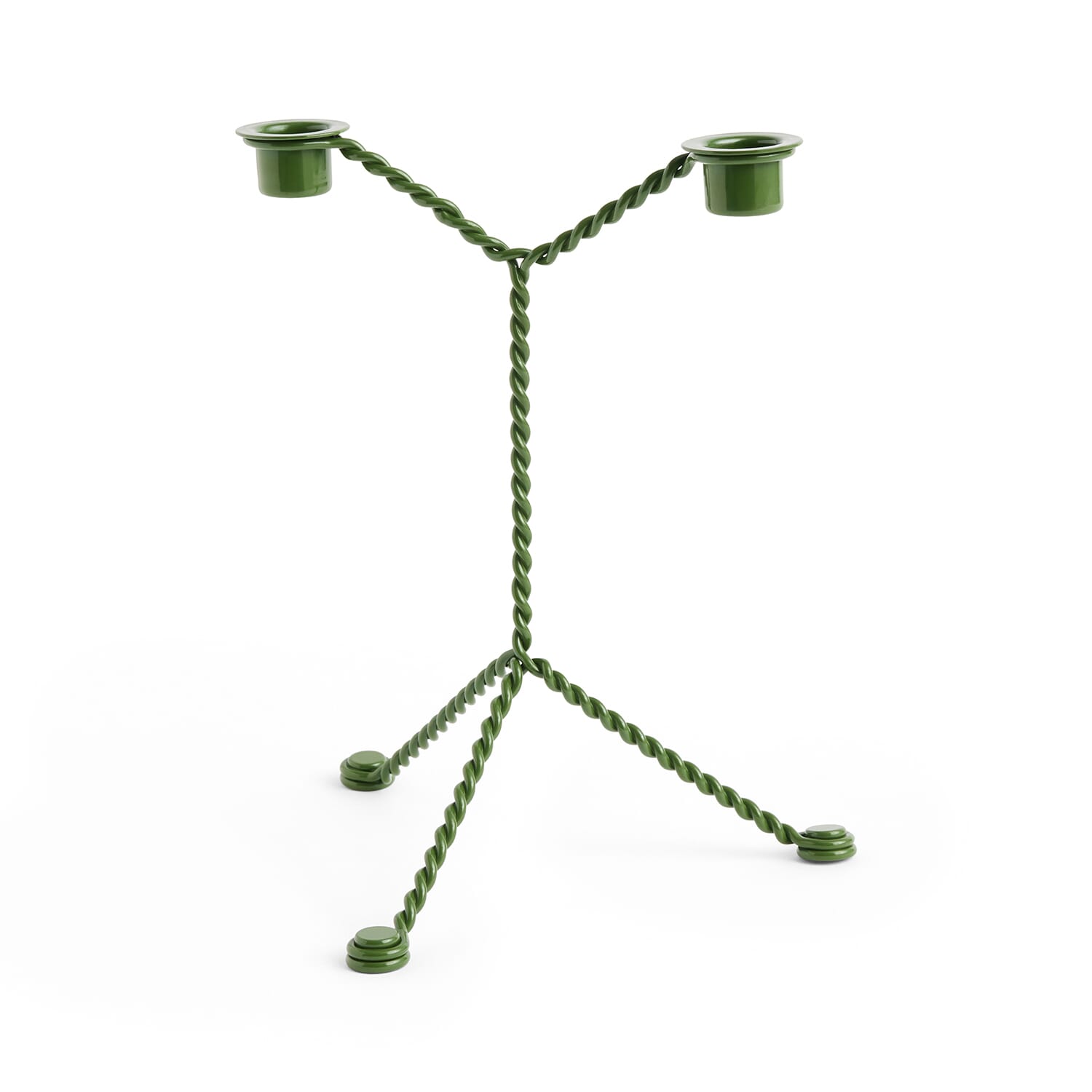 Denne lysestaken er laget av et enkelt stykke tvunnet ståltråd, formet til en dobbel kandelaber. Med sine to lysholdere på toppen og tre skråstilte ben, balanserer den perfekt en enkel, men sofistikert estetikk. Lysestaken passer ideelt på vinduskarmer, spisebord eller andre overflater i hjemmet, og den er tilgjengelig i flere fargealternativer for å passe til enhver interiørstil.