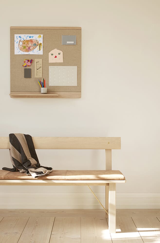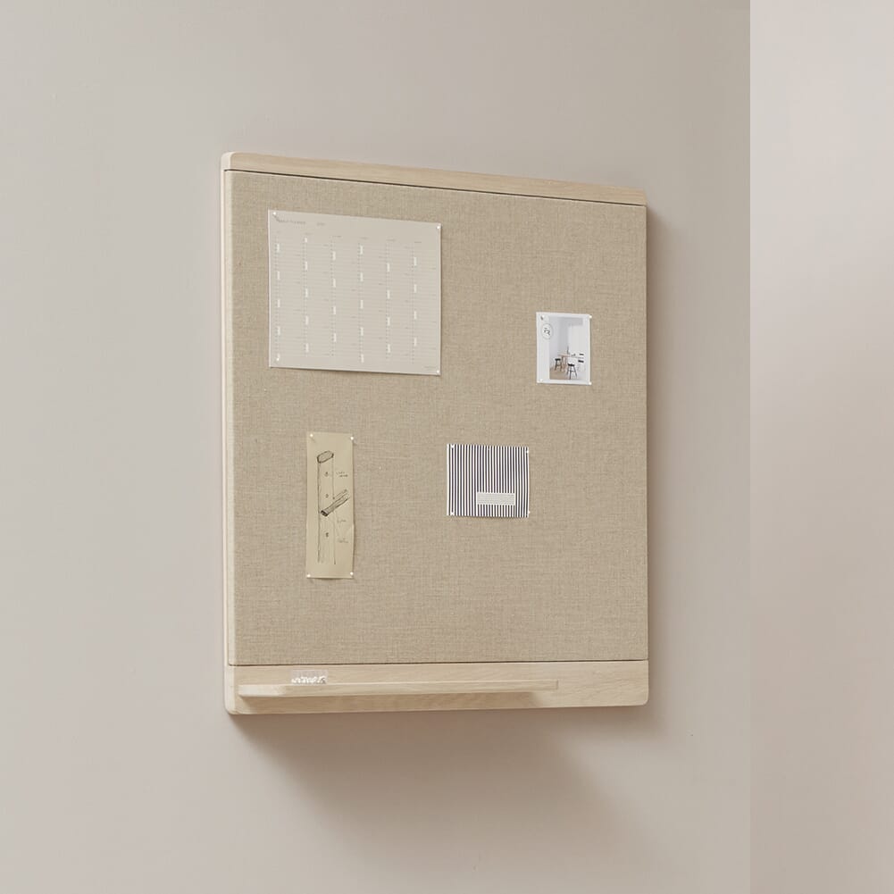 Oppslagstavle designet av Herman Studio som er laget av heltre eik og resirkulert kanvas. Materialene gir tavlen et varmt og naturlig utseende som gjør det morsommere å organisere hverdagen eller vise frem bilder. Nederst er det en liten hylle hvor du kan oppbevare penner eller nåler.