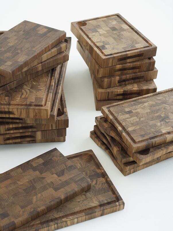 Teak inneholder naturlige oljer som er motstandsdyktige mot fukt og bakterier, og de oppadgående fibrene absorberer støtet fra knivbladene. Dette sikrer en lang levetid - både til brettet og kniven. Dania har praktiske håndtak på hver ende og en renne som samler veske og smuler.