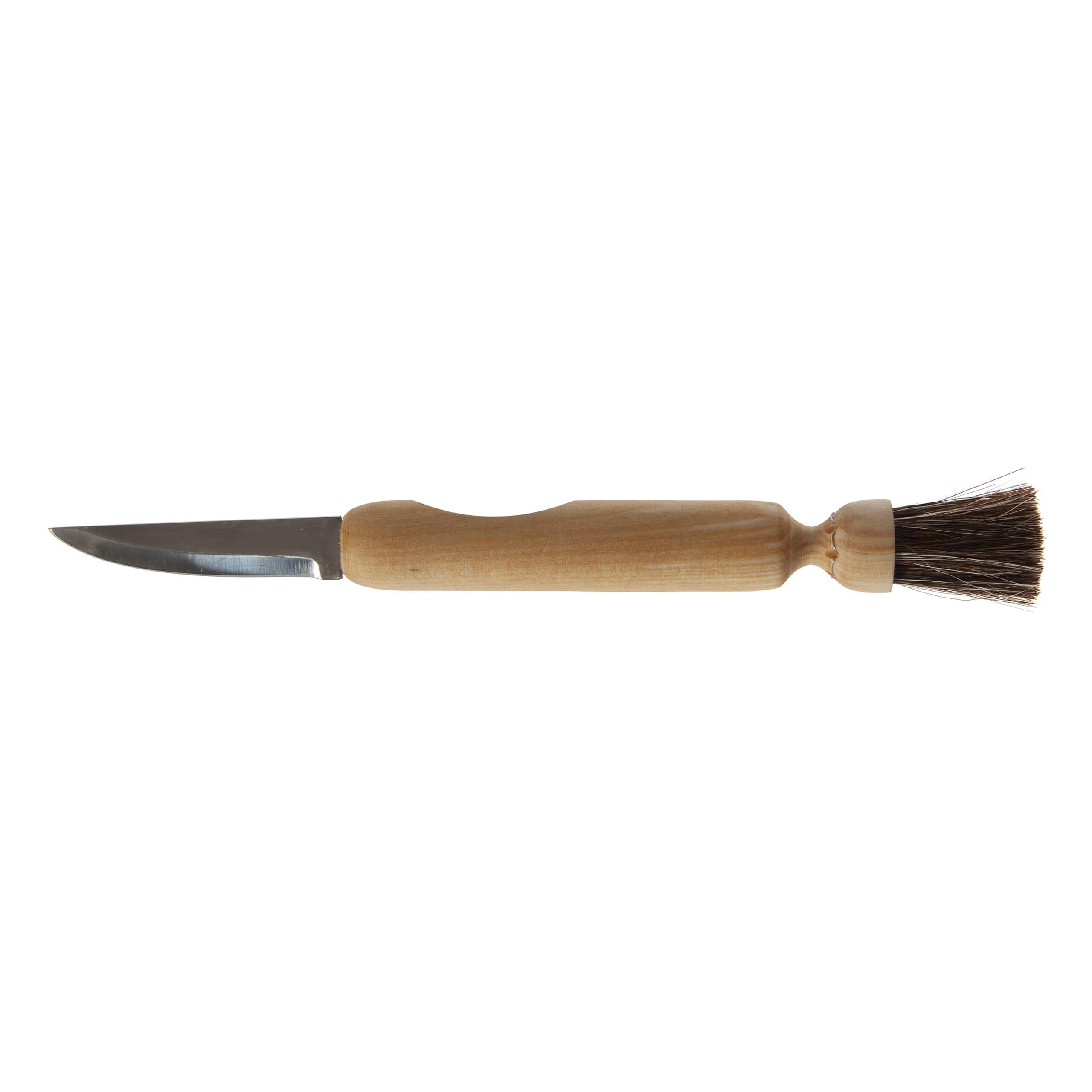 Vakker håndlaget soppkniv for soppjakt i skogen. Laget av oljet bjørk, rustfritt stål og med en naturlig børste av hestehår. Ideell for både soppplukking og rengjøring av sopp. Kniven har et ergonomisk håndtak og en effektiv, men myk børste.