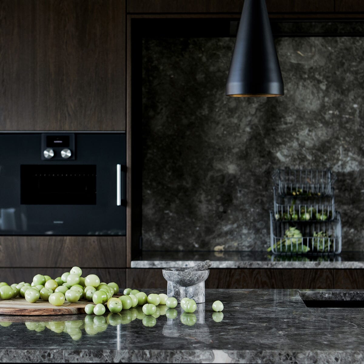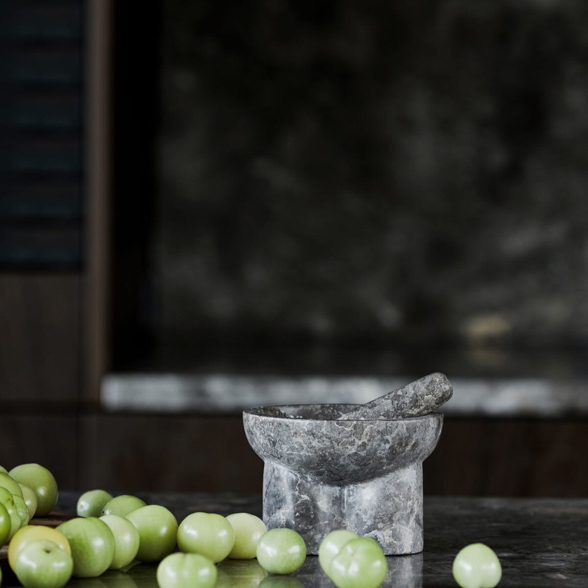 La denne morteren fra House Doctor pryde kjøkkenbordet ditt og fungere som et utmerket verktøy for å lage dine egne deilige krydderblandinger. Morteren, kalt Kulti, kommer med en matchende støter i samme farge og stil. Den skulpturelle formen gir et røft uttrykk som harmonerer fint med de grå og brune tonene. Det solide og dekorative materialet gir et vakkert og funksjonelt design som vil være et flott tillegg til kjøkkenet ditt.