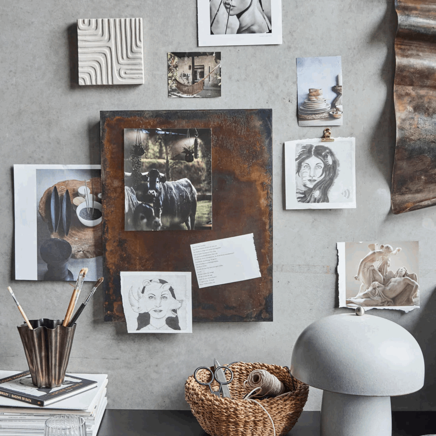 Størrelsen på tavlen gjør den ideell for å samle huskelapper, postkort, kvitteringer eller inspirerende bilder på ett sted. Den fungerer like godt alene som i kombinasjon med flere tavler for å skape en spennende vegginstallasjon. Nema tavlen er kun beregnet for innendørs bruk, og bør rengjøres med en tørr klut. Siden overflate og farge kan variere noe, får hver tavle sitt helt unike uttrykk – en detalj som gir ekstra sjarm og autentisitet til interiøret.