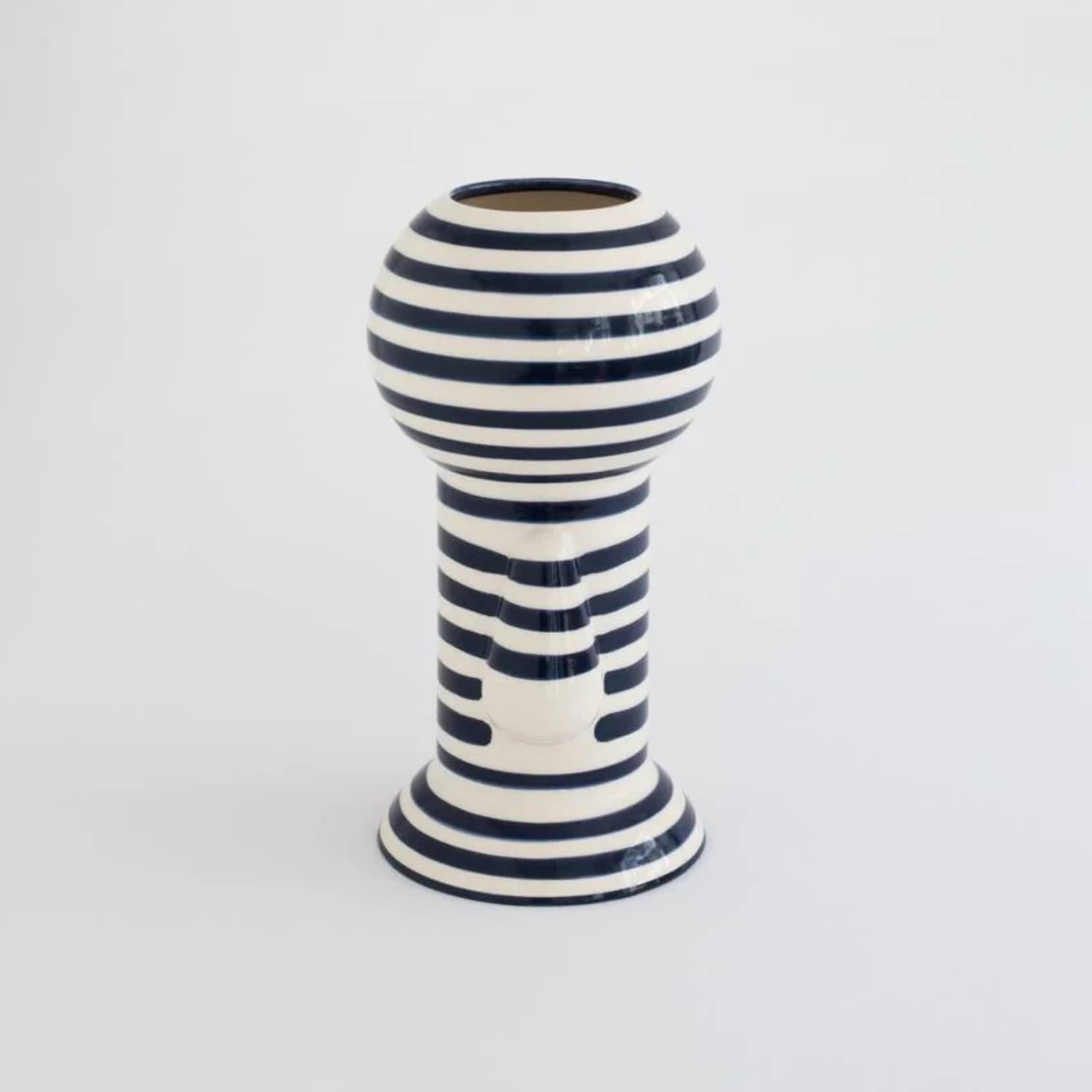 Vasen kombinerer skulpturell form med en dyp, elegant blåfarge som gir den et sofistikert og moderne uttrykk. Den kompakte, men iøynefallende silhuetten gjør den like egnet som et statement alene som sammen med andre objekter i en stilfull gruppe. Hver vase er håndlaget i Portugal og bærer preg av små variasjoner og unike detaljer som vitner om ekte håndverk. Perfekt for deg som ønsker å bringe kunstnerisk dybde og farge inn i hjemmet.