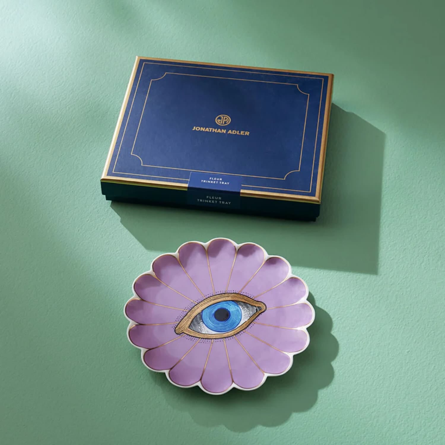 Fleur Tray i blått og lilla er et lite, men iøynefallende fat som kombinerer lekne farger med elegante gull-detaljer.