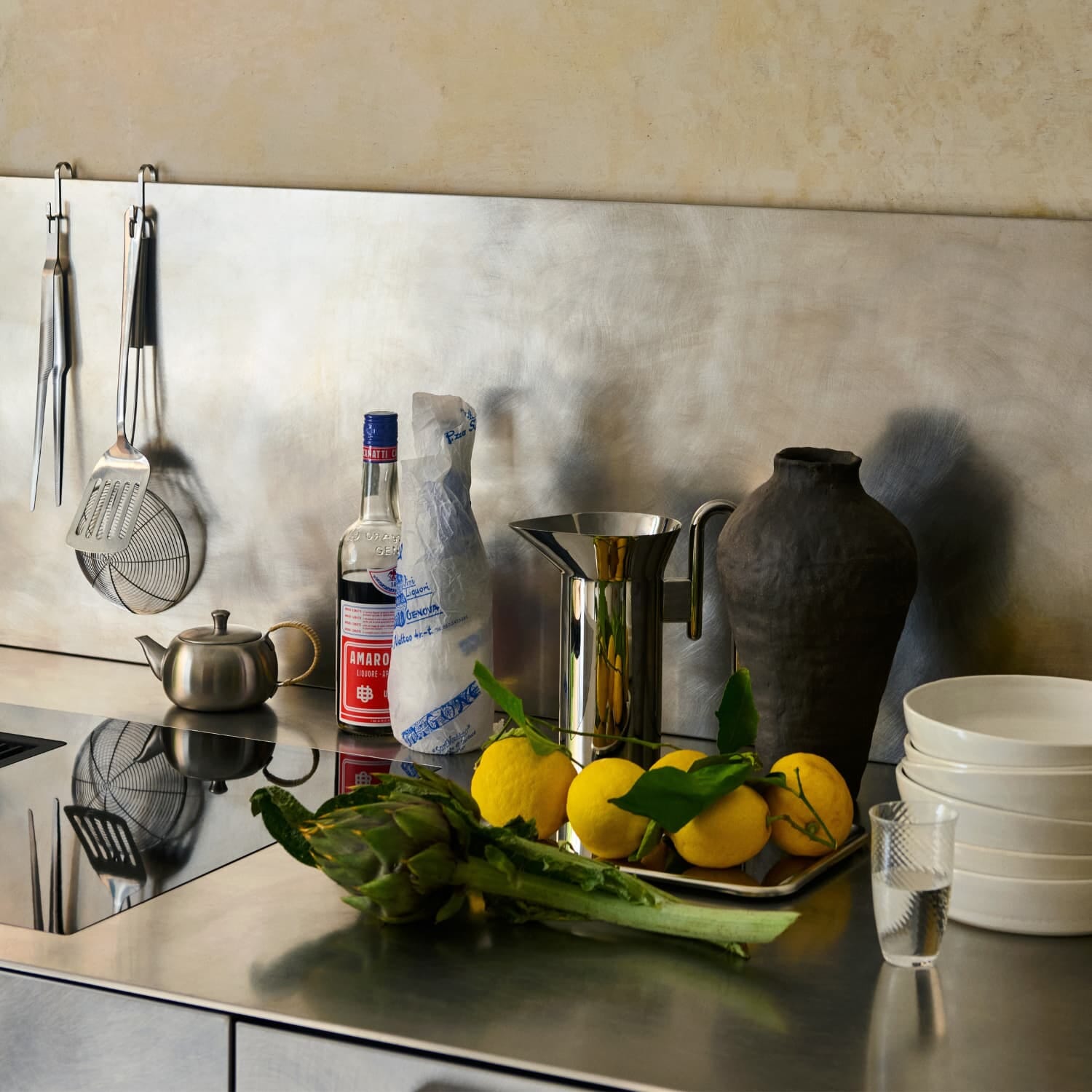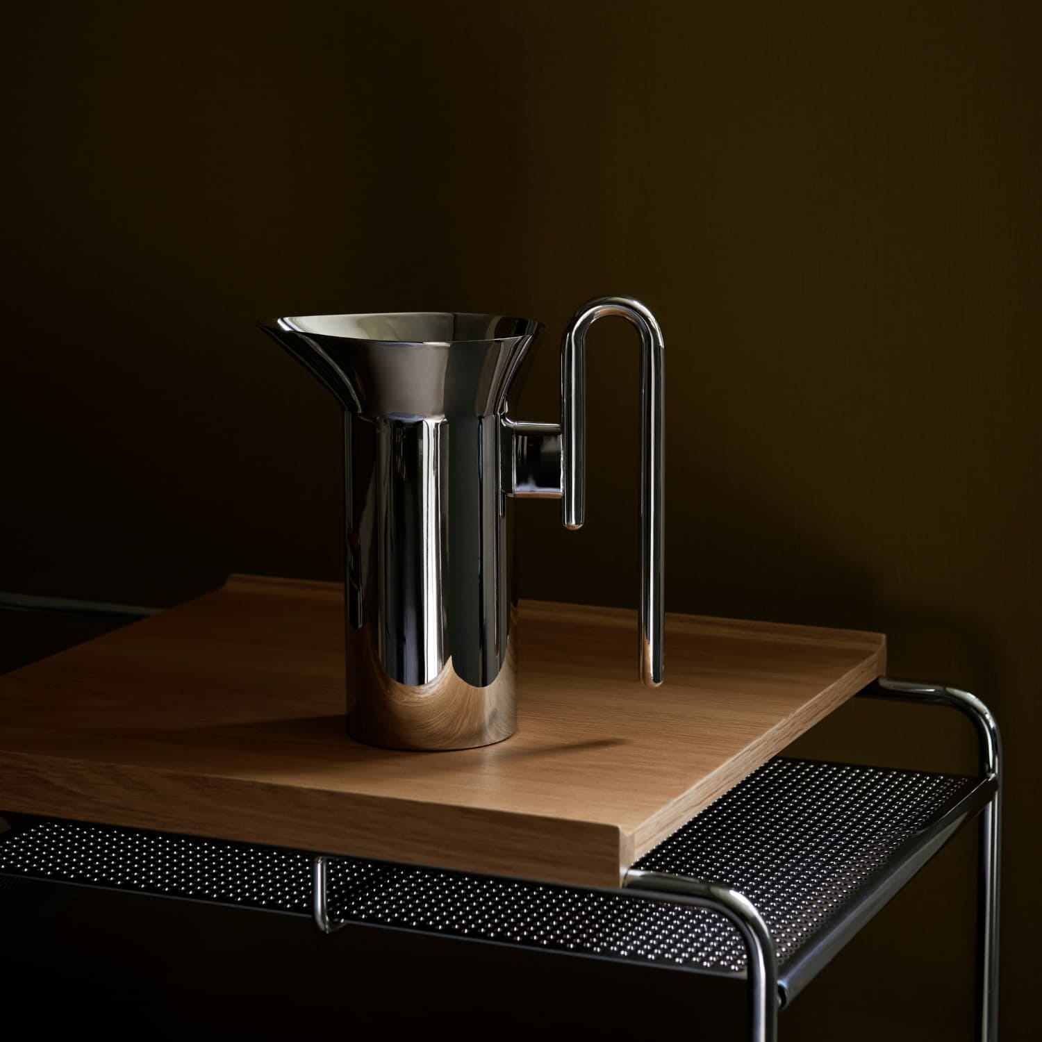 Kannen rommer 1 liter og er laget i polert rustfritt stål med et formspråk som kombinerer funksjonalitet og skulpturell enkelhet. Kroppen er spunnet og sveiset av metallplater, mens helletuten er presist stemplet og håndtaket er bøyd av stålrør og elegant festet til kroppen. Resultatet er et slitesterkt og tidløst serveringsobjekt.