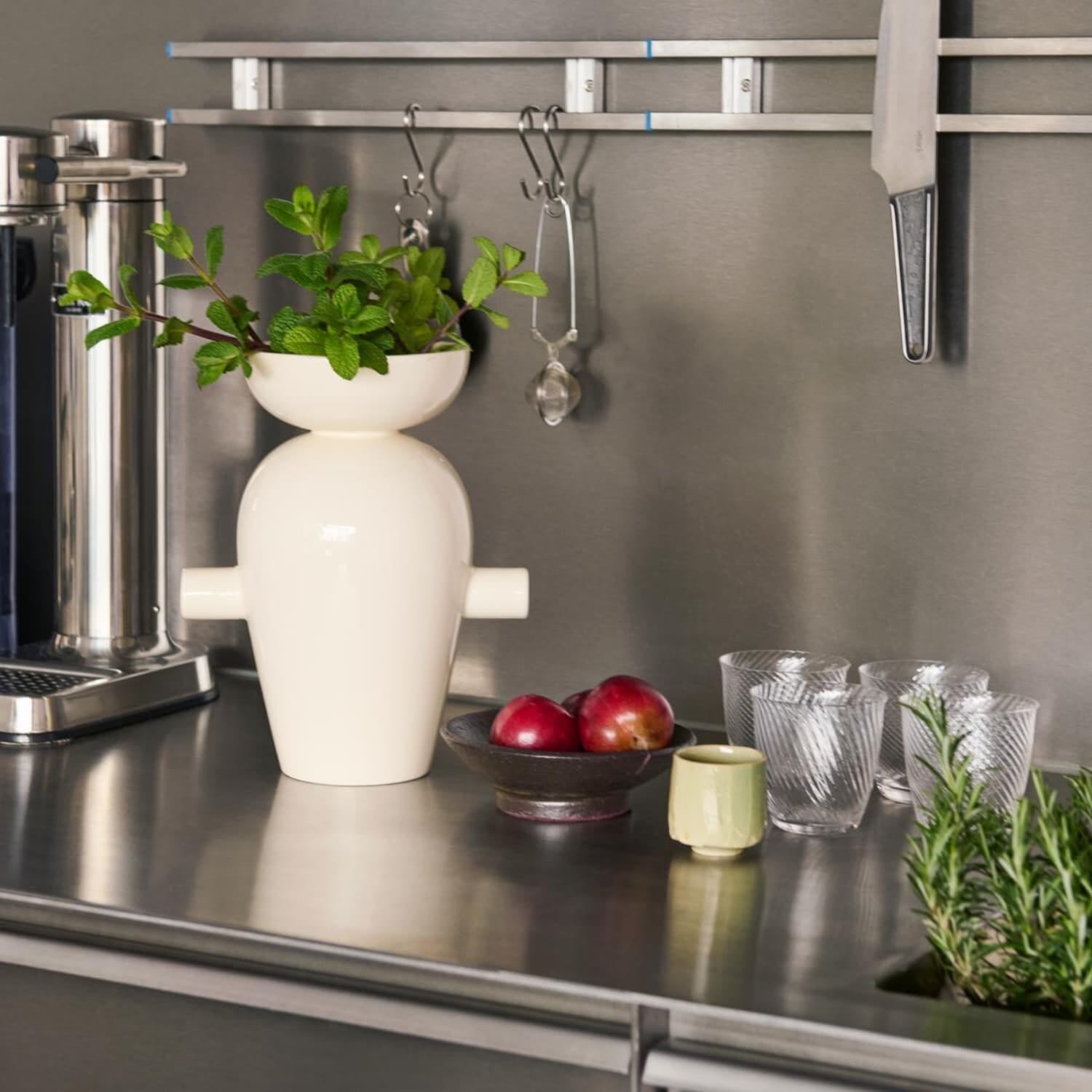 I den myke nyansen Cream blir vasen et tidløst og allsidig innslag i hjemmet. Den slanke halsen gjør at blomster må velges med omtanke, noe som fremmer en mer bevisst og rolig tilnærming til å arrangere buketter – en liten påminnelse om å stoppe opp og skape øyeblikk av ro i hverdagen.