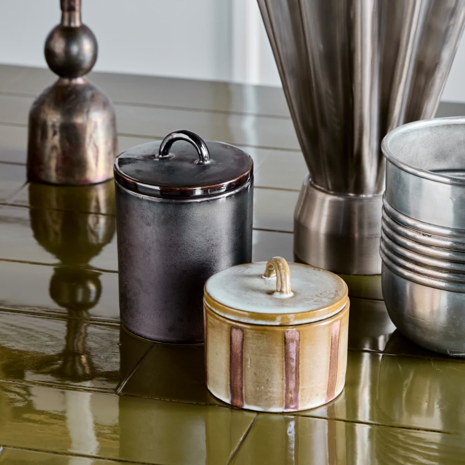 Gi hjemmet et varmt og personlig uttrykk med Oppbevaringsbokser Tallic – et sett med to håndlagde bokser i steintøy.