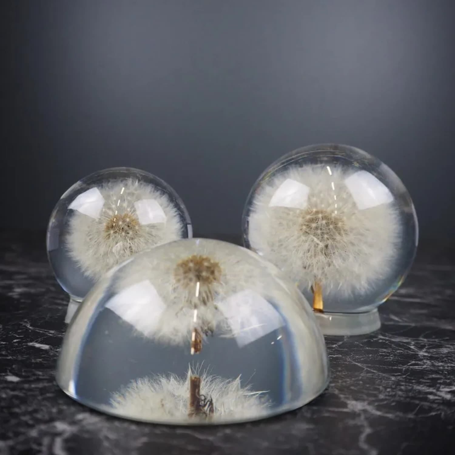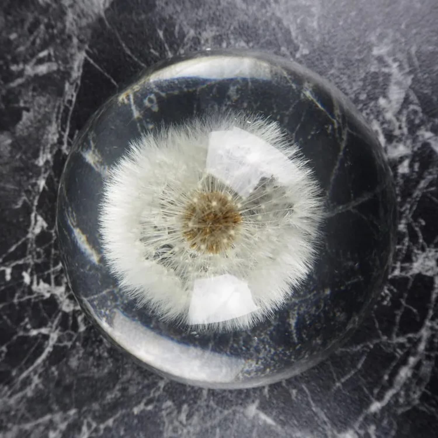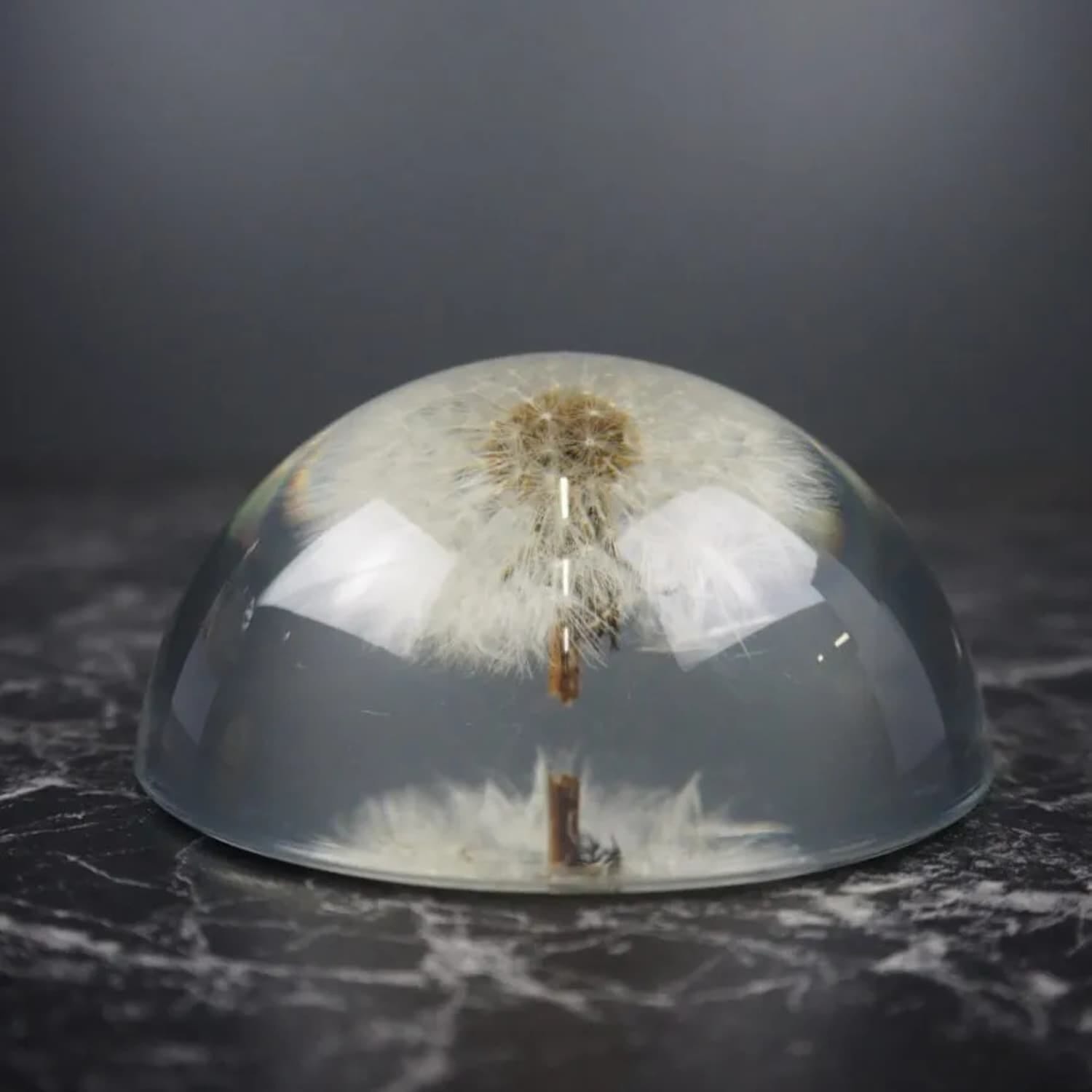 Papirvekt Løvetann Halv er et unikt og poetisk skrivebordsobjekt som fanger øyeblikket av en løvetann – foreviget under en klar halvkule.