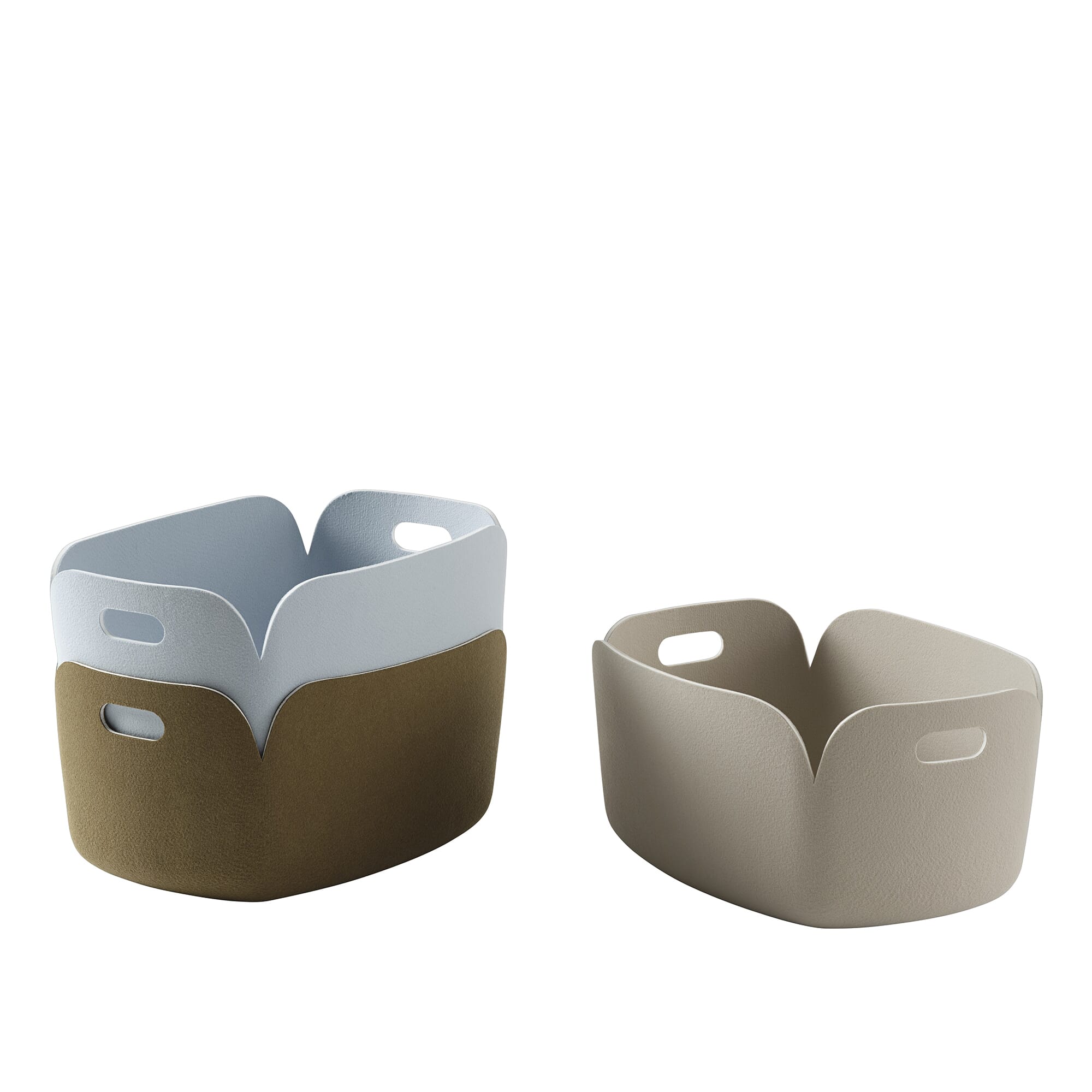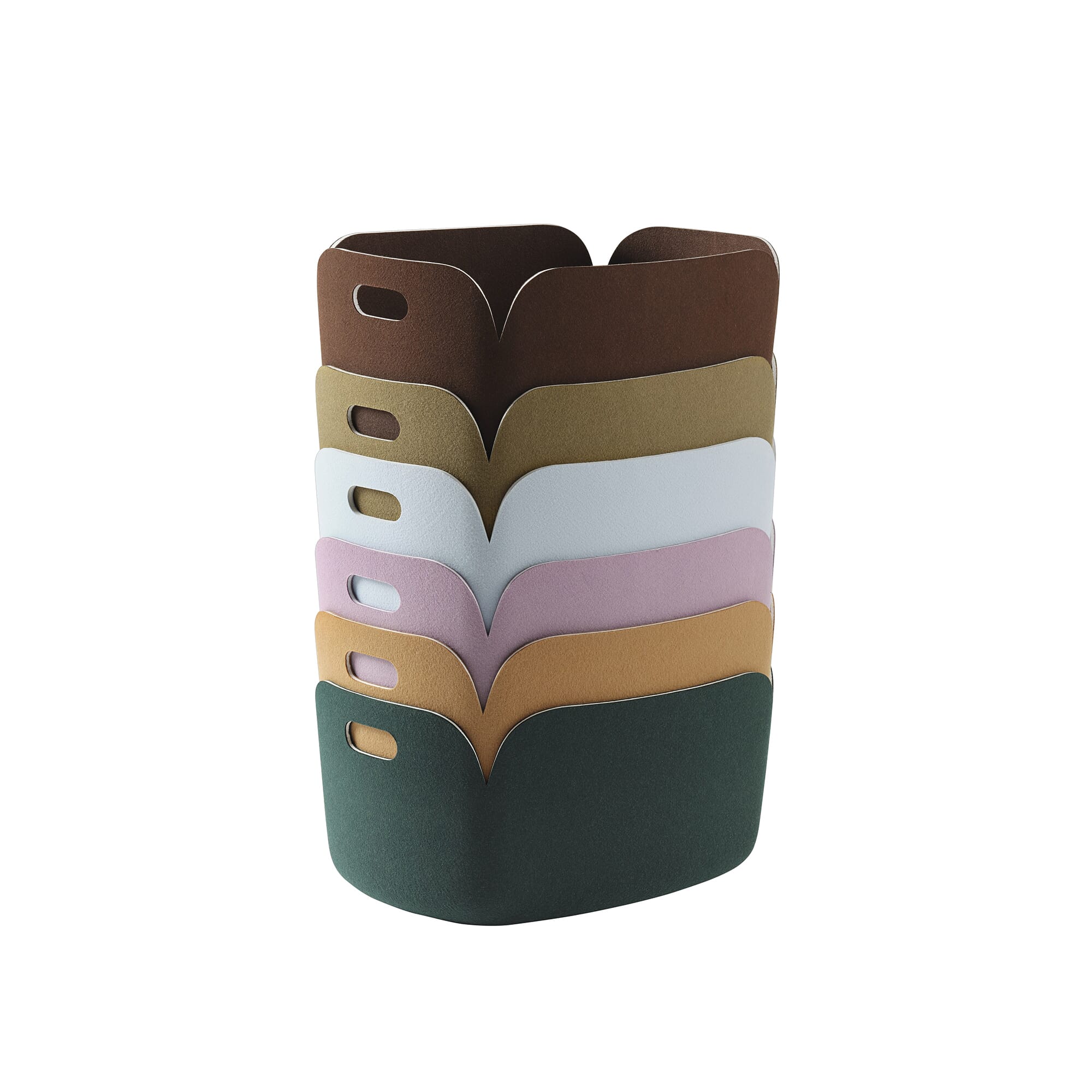 Restore-serien fra Muuto er en serie praktiske kurver med en moderne vri. De er laget av fibre fra resirkulerte plastflasker og er tilgjengelig i en rekke størrelser og farger. Perfekt til oppbevaring av klær, leker, ved eller andre gjenstander.