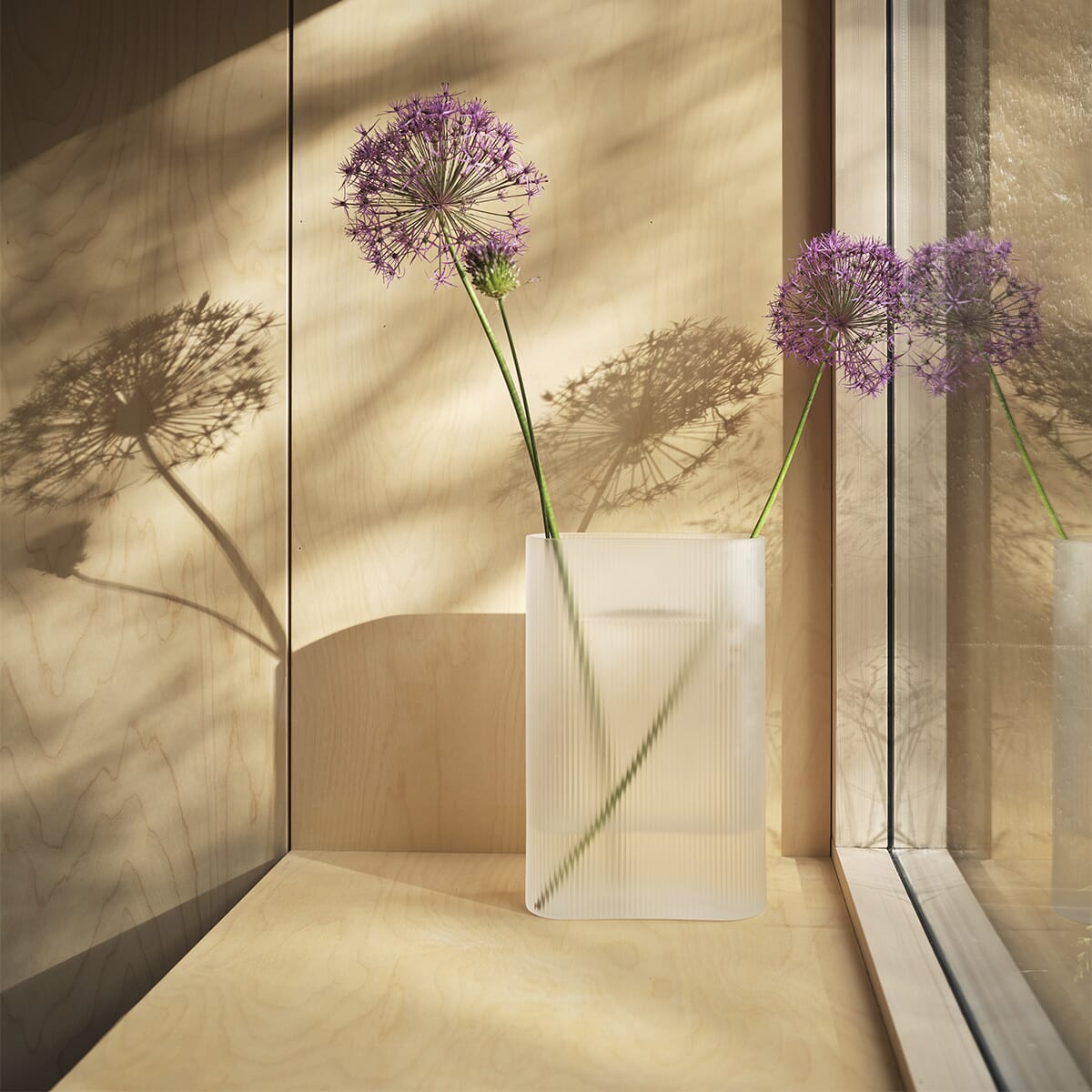 Muutos Ridge Vase er en skulpturell og moderne vase som gir en ny tilnærming til blomsteroppsatser. Selv uten blomster fungerer den som et kunstnerisk innslag i rommet. Den elegante fordypningen i designet gir ekstra funksjonalitet ved å holde blomstene oppreist og fungerer som et diskret håndtak for enkel flytting mellom rom.