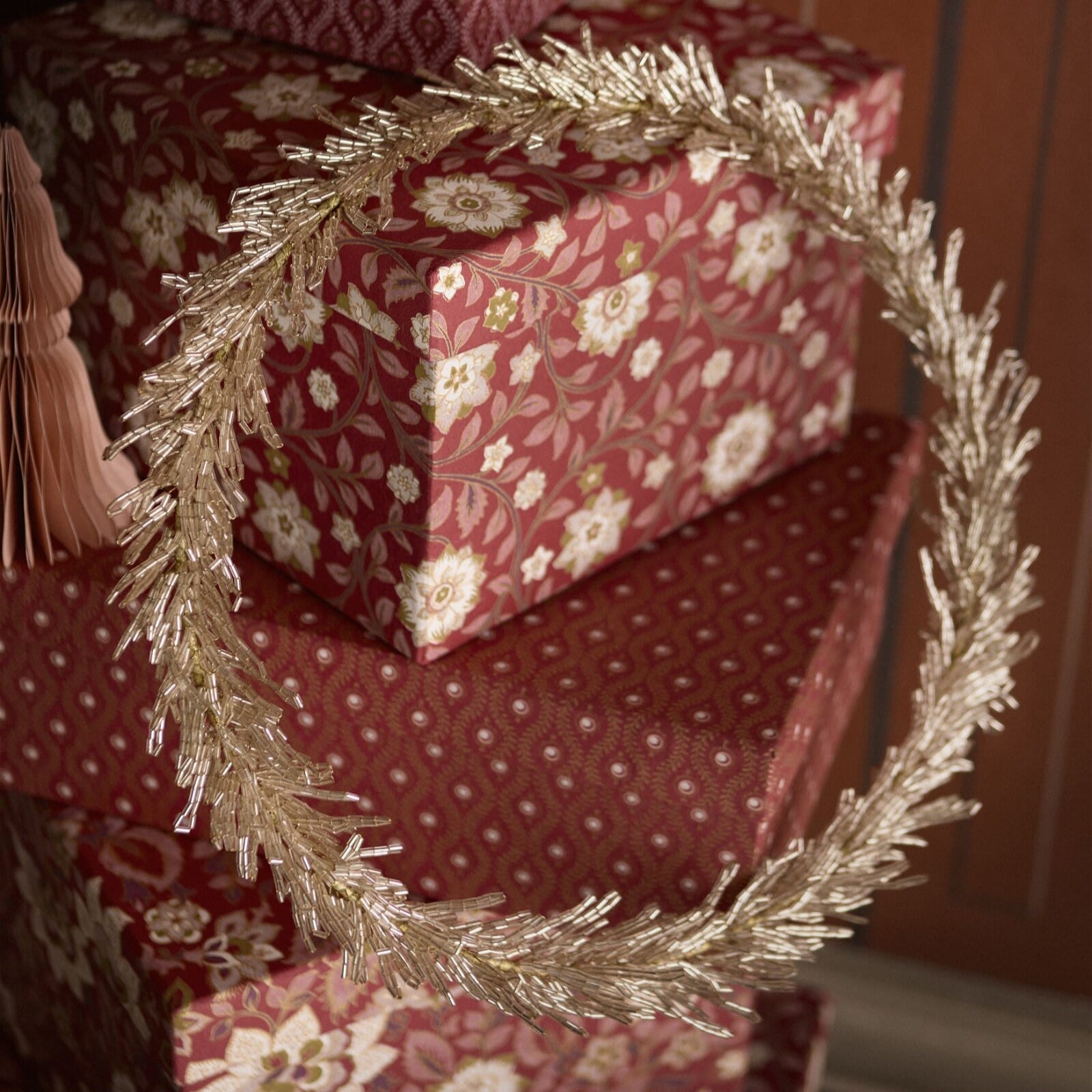 Perlet krans fra Bungalow. Perlene er laget av glass i en nydelig champagnefarge som glitrer opp i lyset.