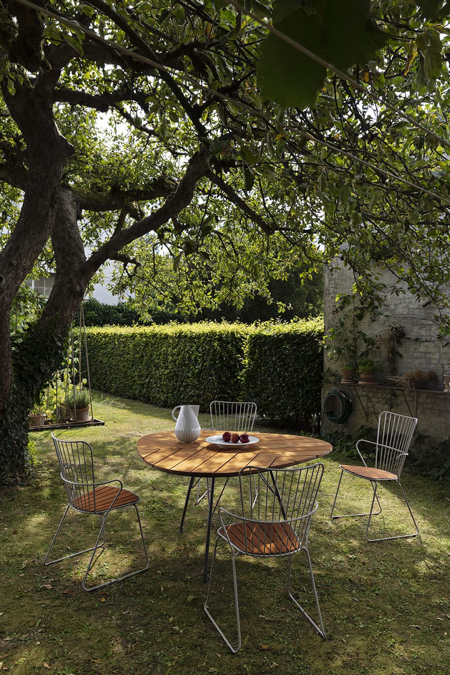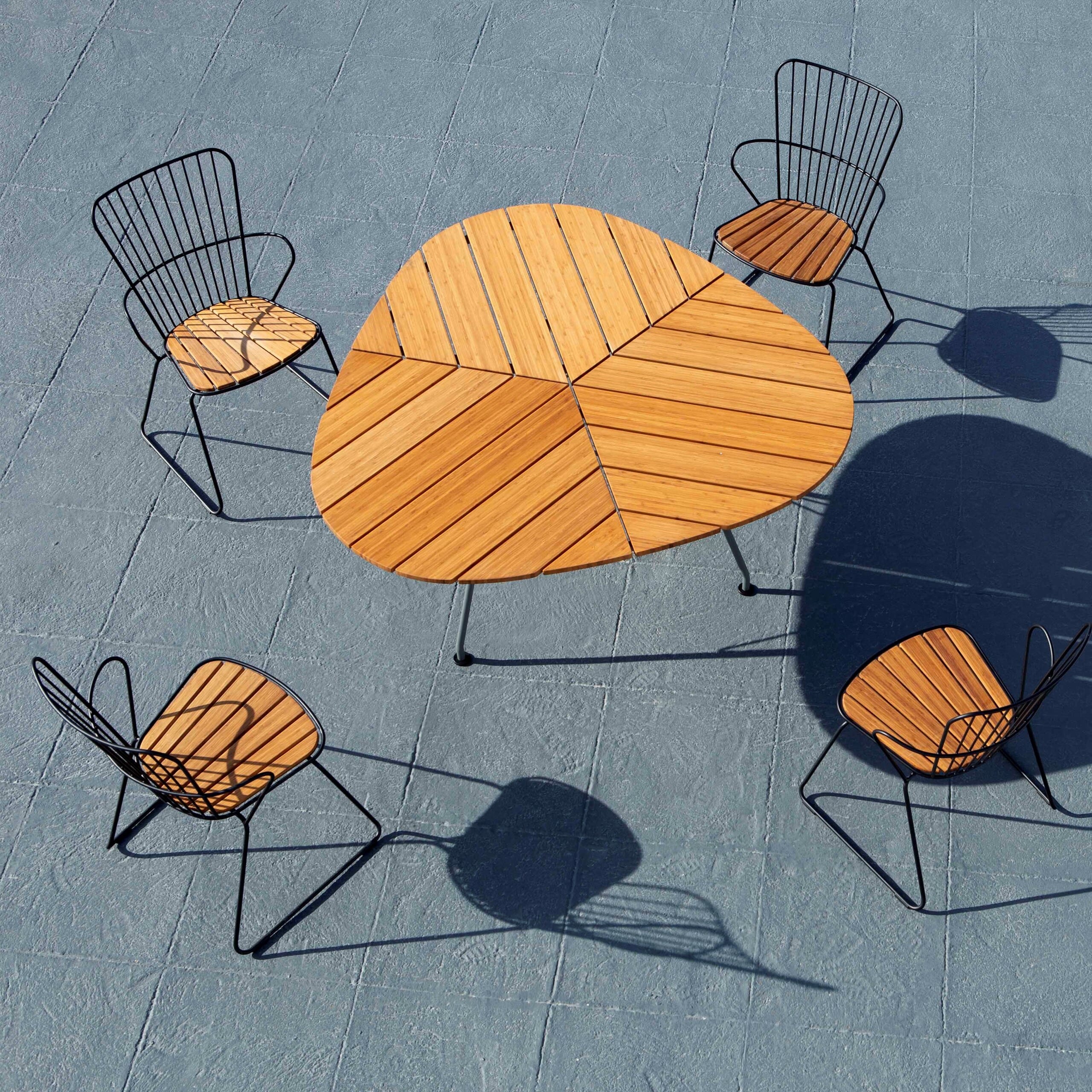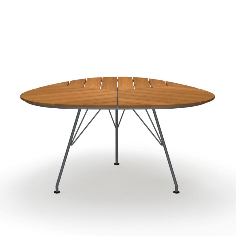 Leaf spisebord har en unik trekantet form og er laget av bambuslameller og pulverlakkert stål. Et vakkert utebord inspirert av formen til et blad.