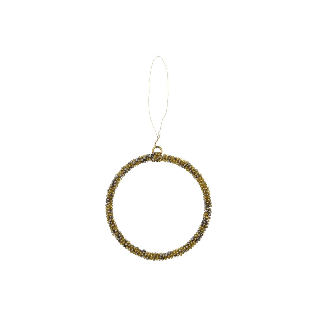Sett med en stjerne, ett hjerte og en sirkel for å henge på en gren, ha på juletreet, bruke i kranser eller henge i vinduet. Laget av perler i en miks at sølv og gull.