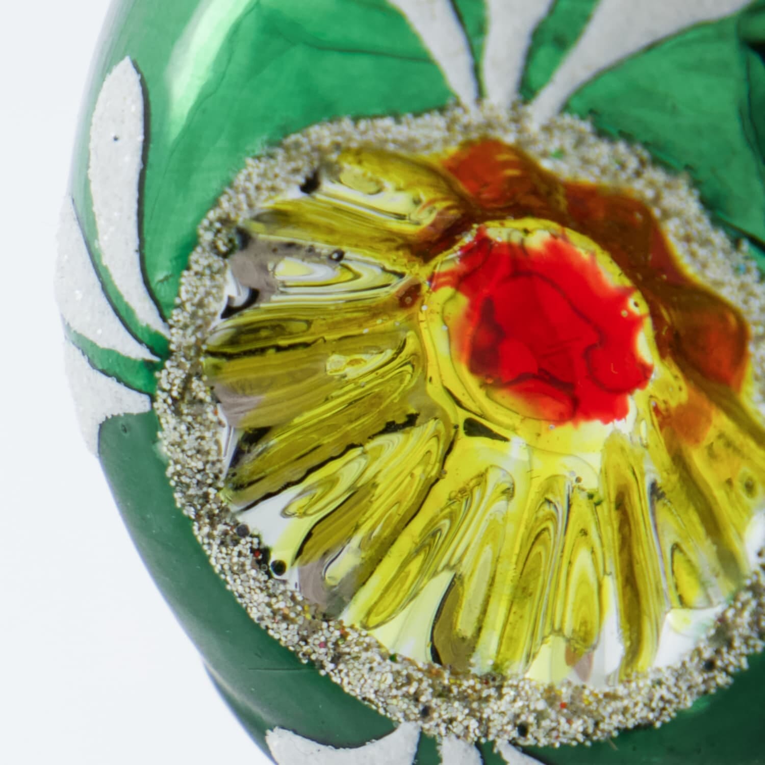 Disse vakre dråpeformede kulene i grønt glass er munnblåst og håndmalt med hvite detaljer, noe som gjør hver enkelt ornament helt unik. Den klassiske designen kombineres med en gullfarget fordypning og sølvglitterkant som fremhever det vintage-inspirerte uttrykket og skaper en tidløs julestemning.