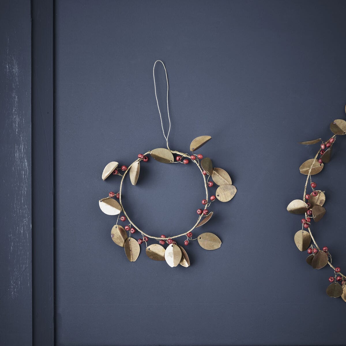 Når det gjelder tradisjonell juledekor, er det få ting som kan konkurrere med en vakker krans. Gi hjemmet ditt en koselig atmosfære med denne håndlagde kransen fra House Doctor, satt sammen med gyldne messingblader og varme, røde treperler. Med denne klassiske elegansen blir hjemmet ditt klart for å hylle høytidens samvær og glede. Heng kransen på veggen eller i et vindu for å skape den perfekte julestemningen og tilføre litt magi til din juleinnredning.