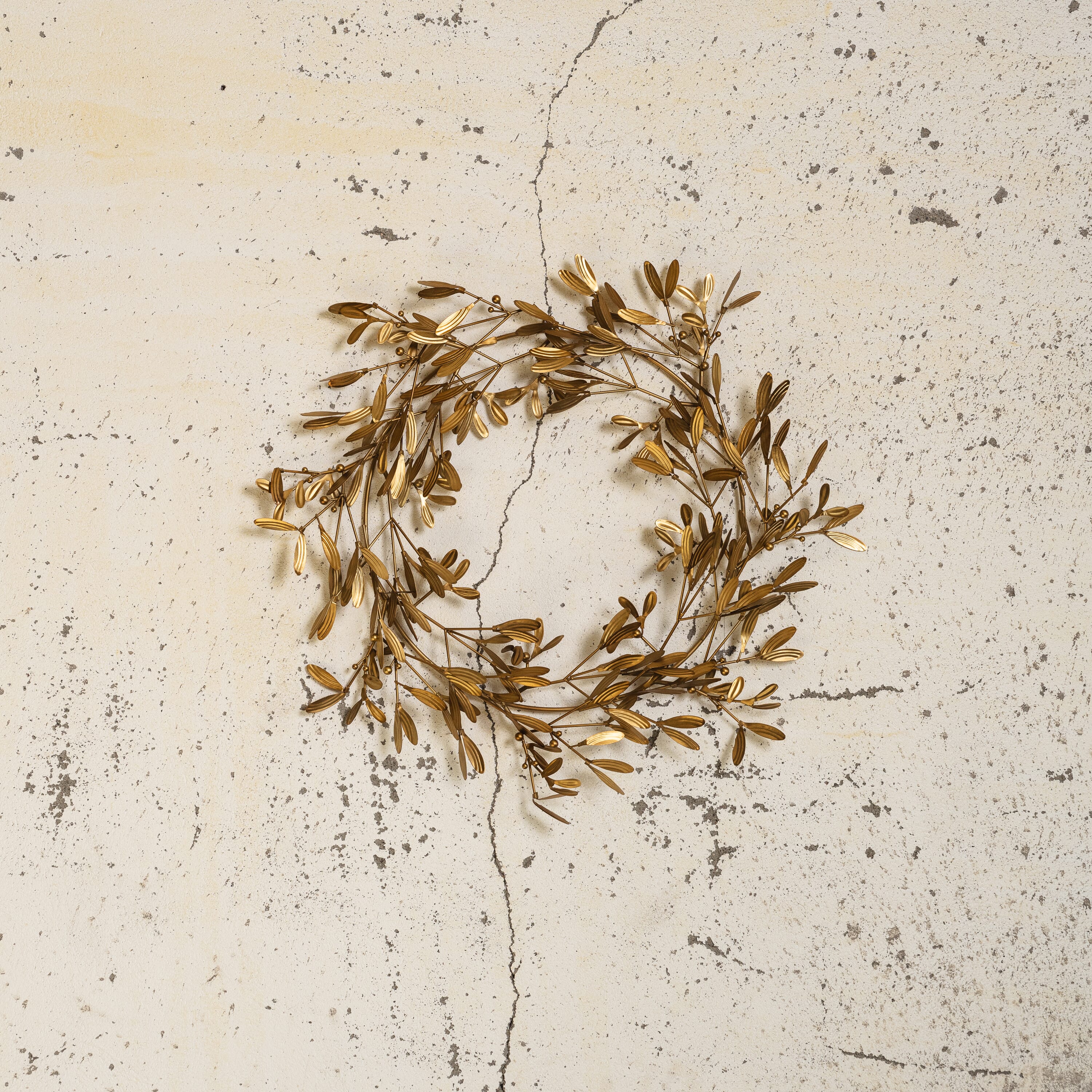 Løft juleinteriøret med denne vakre gullfargede metallkransen, et dekorativt element som passer perfekt for julesesongen. Kransen er laget med vakre, detaljerte blader som gir den et naturinspirert utseende, samtidig som den stråler med en gullfarget finish. Den er ideell for å henge på døren, over peisen, eller som en del av en borddekorasjon.