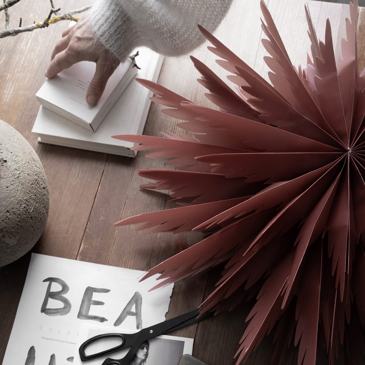 Gi hjemmet ditt en varm og lun atmosfære med Liz 50 Red Ochre. Den dyp-røde tonen i det semitransparente papiret gir et mykt og stemningsfullt lys som vekker følelsen av julens magi. Hver stjerne er nøye brettet for hånd og leveres i en elegant, hvit forpakning – perfekt som gave eller som en stilig detalj i ditt eget hjem.